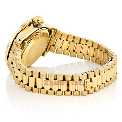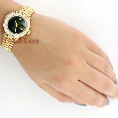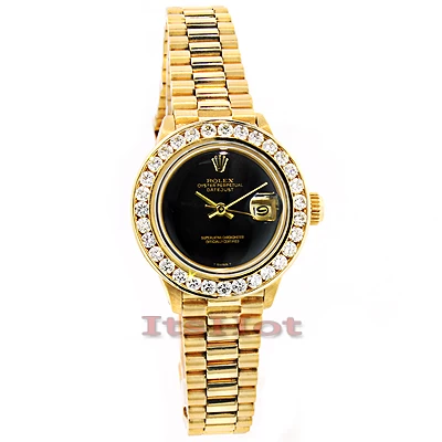 This Rolex Datejust President is from our diamond watches for women collection. This 18K Yellow Gold Rolex Datejust President Ladies Diamond Watch features 2.50 carats of genuine diamonds, an 18K Yellow gold case, and an 18K Yellow gold band. This Rolex Diamond Watch for women showcases a 26mm case, black dial, and a date display at the 3 o’clock position. Please note: this custom Rolex diamond watch is pre-owned in excellent condition and comes with a 5-year warranty from ItsHot.com.
