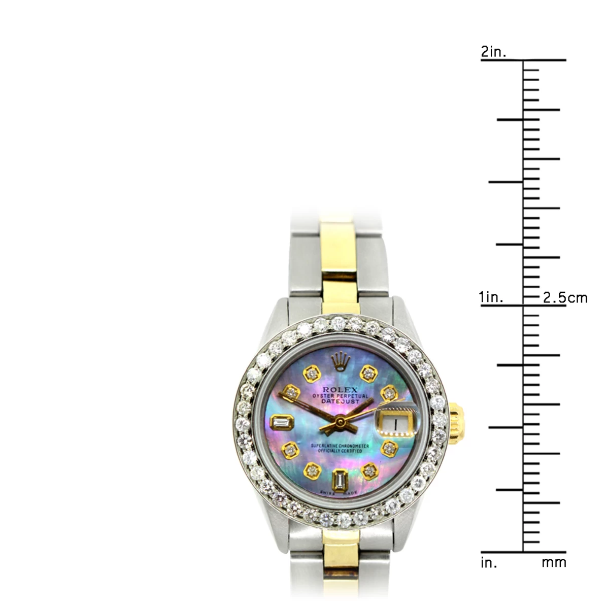 This luxurious Rolex Datejust Ladies Custom Diamond Watch features 1.2 carats of sparkling genuine diamonds, a brushed stainless steel case, and stainless steel and 18k yellow gold plated band. This Rolex Ladies Diamond Watch showcases a blue mother of pearl dial and a date display at the 3 o’clock position. Please note: this custom Rolex diamond watch is pre-owned, in Like New condition, and comes with a 5-year warranty from ItsHot.com.