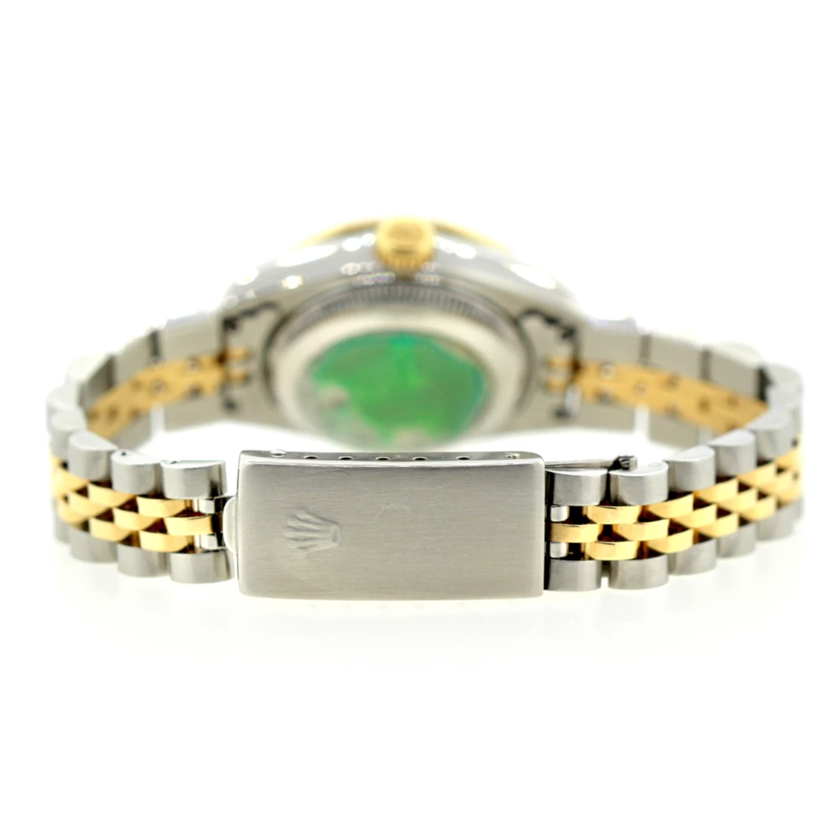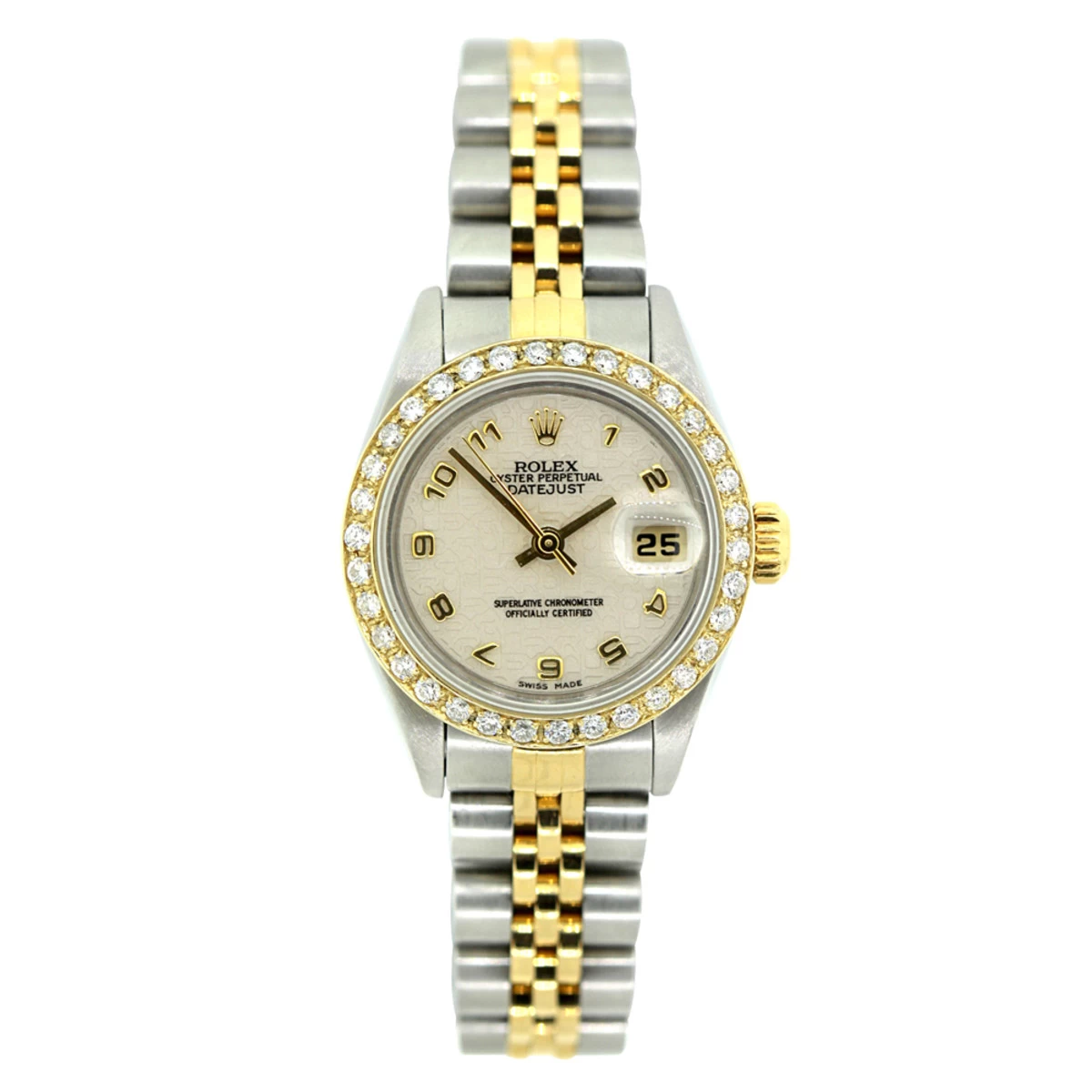 This luxurious 26mm Rolex Oyster Perpetual Datejust Diamond Watch for Women features 1 carat of sparkling genuine diamonds, a brushed stainless steel case, a gold bezel with diamonds, and a two-tone band. This Rolex Ladies Diamond Watch showcases a jubilee dial and a date display at the 3 o’clock position. This custom Rolex diamond watch is pre-owned, in excellent condition, and comes with an original Rolex box and a 5-year warranty from ItsHot.com.