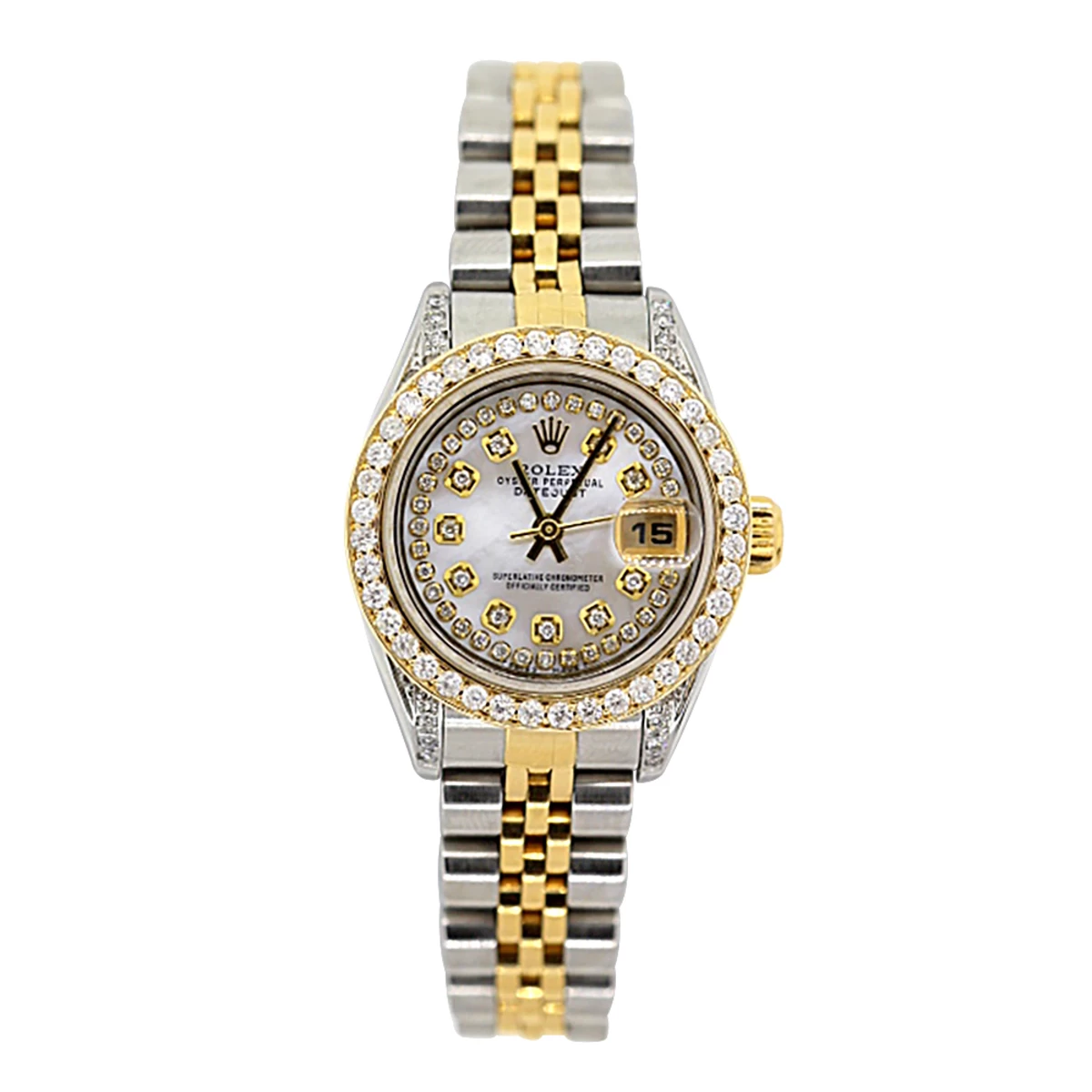 This luxurious Rolex Oyster Perpetual Datejust Ladies Diamond Watch is a custom diamond watch featuring white mother of pearl dial, 2.2 carats of sparkling genuine diamonds, a 26mm brushed stainless steel case and yellow gold bezel. This Rolex Diamond Watch for Women showcases a white mother of pearl dial and a date display at the 3 o’clock position. Please note: this custom Rolex diamond watch is pre-owned, in excellent condition and comes with a full year warranty from ItsHot.com.
