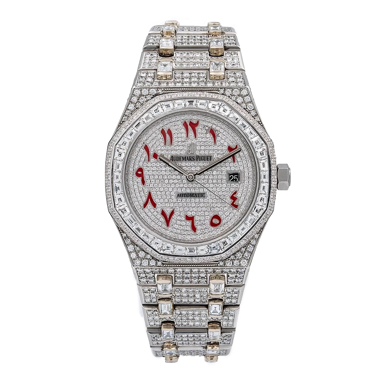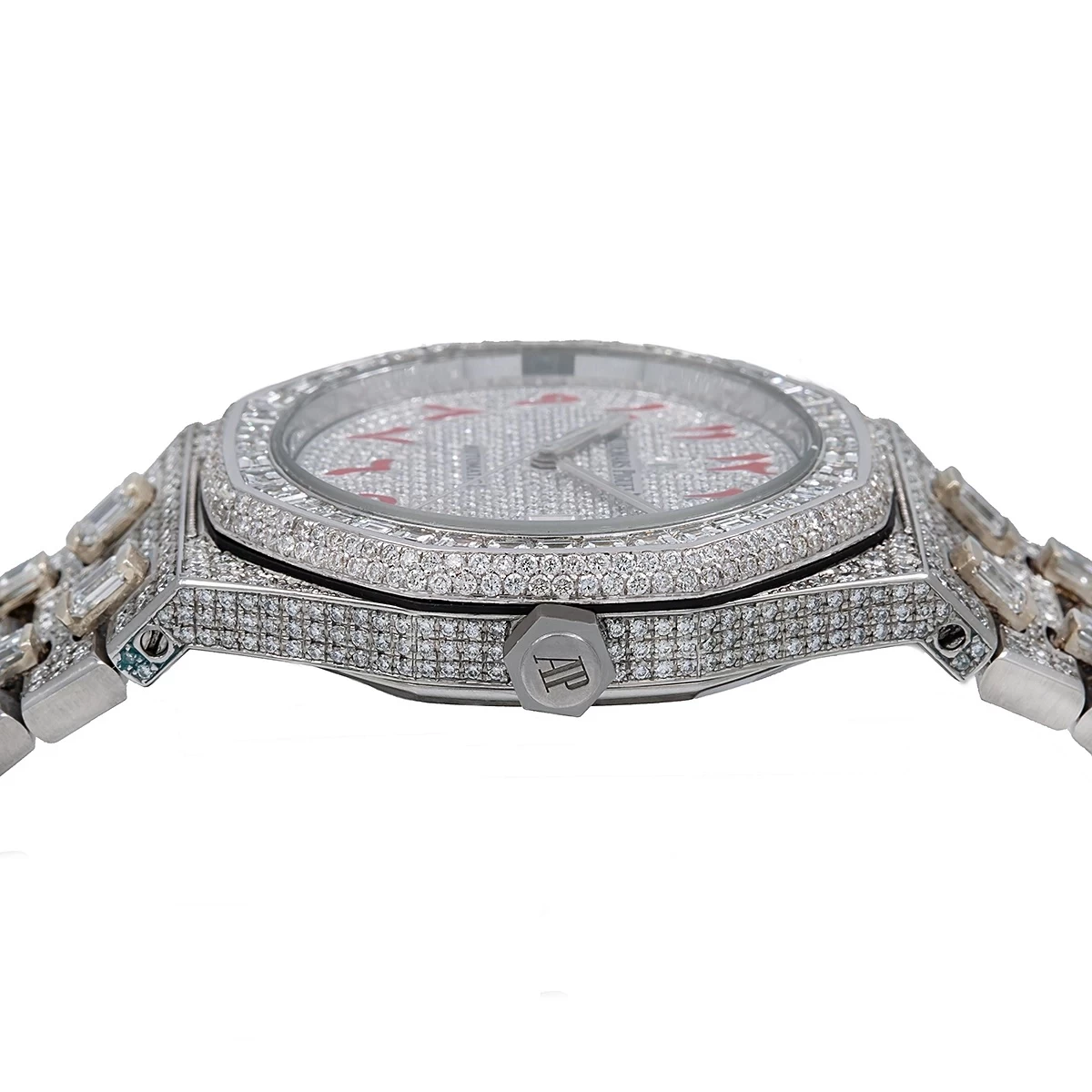 This hypnotic Audemars Piguet Royal Oak Self Winding 15400st diamond watch for men is fully bust down and features a remarkable 29.75 carats of dazzling different-shaped white diamonds with baguette diamonds masterfully set in its bezel, and round diamonds set in the case, dial, and straps of the watch. Showcasing a breathtaking fully iced-out look, a diamond stainless steel bracelet with baguette and round diamonds, and a bezel full of meticulously set baguette diamonds, this watch will wrap your wrist in endless brilliance. Furthermore, this incredible timepiece’s dial is a total show stopper – a white custom diamond dial with one-of-a-kind red Arabic numbers won’t leave anyone indifferent. Please note: this custom diamond watch for men is pre-owned, in excellent condition, and comes with a 5-year warranty from ItsHot.com