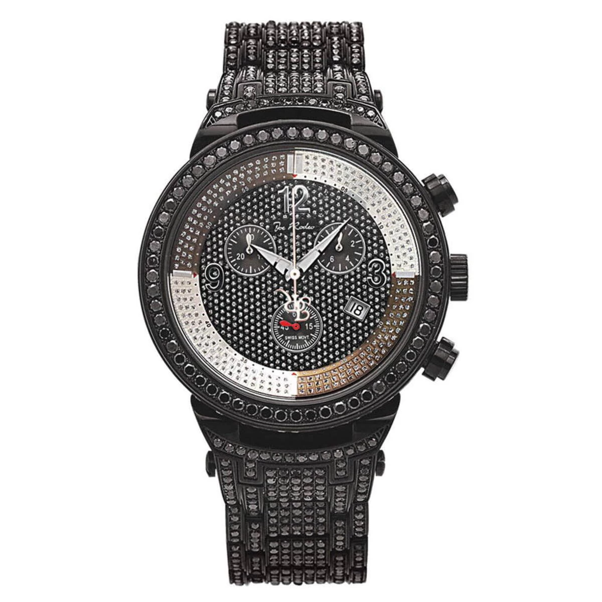 Black Diamond Watches for Men: This Joe Rodeo Master Watch features 25 carats of sparkling black diamonds on the bezel, on the sides and lugs of the black tone stainless steel case and the black tone stainless steel fully paved in black diamonds band. This exquisite Joe Rodeo men’s diamond watch showcases a dial paved in sparkling white diamonds with three black chronograph subdials, a date display window at the 4 oclock position. This diamond watch by Joe Rodeo is equipped with a super accurate Swiss-made chronograph quartz movement. The case is water-resistant to 100m (330 ft).