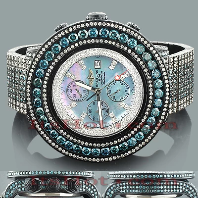 This completely Custom Breitling Super Avenger Men’s Diamond Watch features 55.70 carats of sparkling white and blue diamonds on the bezel, blue diamonds on the lugs and the sides of the black tone stainless steel case; and the black tone stainless steel band fully paved in blue and white diamonds. This Breitling diamond watch showcases a blue mother of pearl dial with three chronograph subdials, a date display window at the 3 o’clock position, and 2 rows of glistening white stones around it. The case is water-resistant to 100m (330 ft). Please note that diamonds are custom set in this watch and the watch can be further customized with a different face or different color or size diamonds.