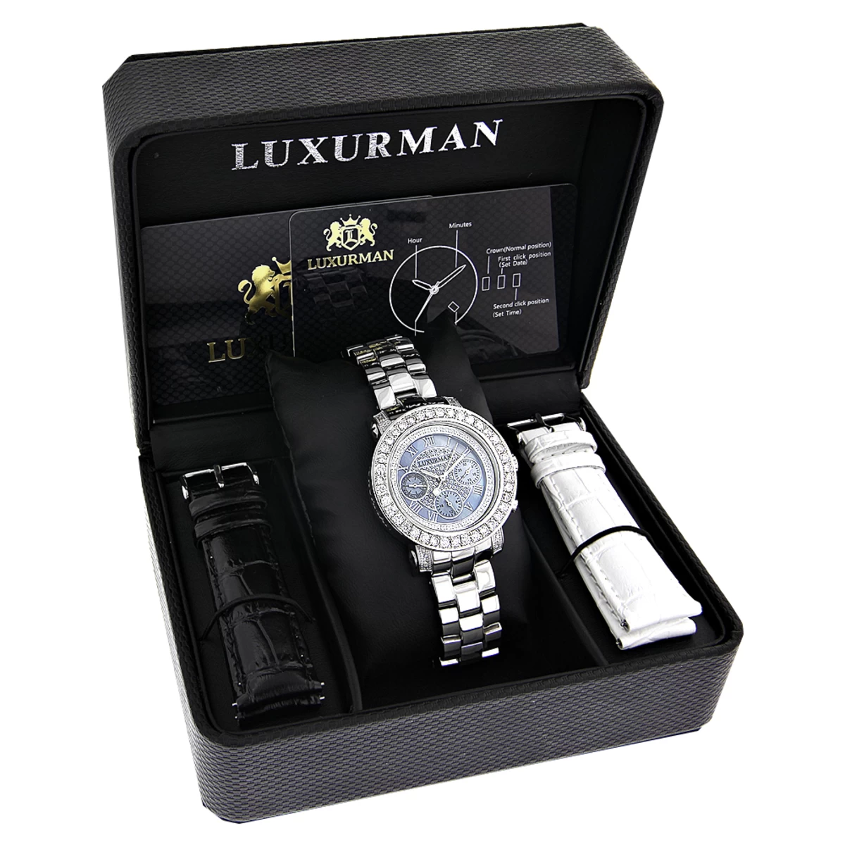 Diamond Watches For Women: this Luxurman Ladies Blue MOP Montana Watch features 3 carats of genuine diamonds masterfully set on the bezel and lugs of the silver tone stainless steel case. The blue mother of pearl dial has three subdials and is paved in white stones. This diamond watch by Luxurman comes with two extra interchangeable straps in different colors, 2 year warranty and makes a perfect present for any occasion.
