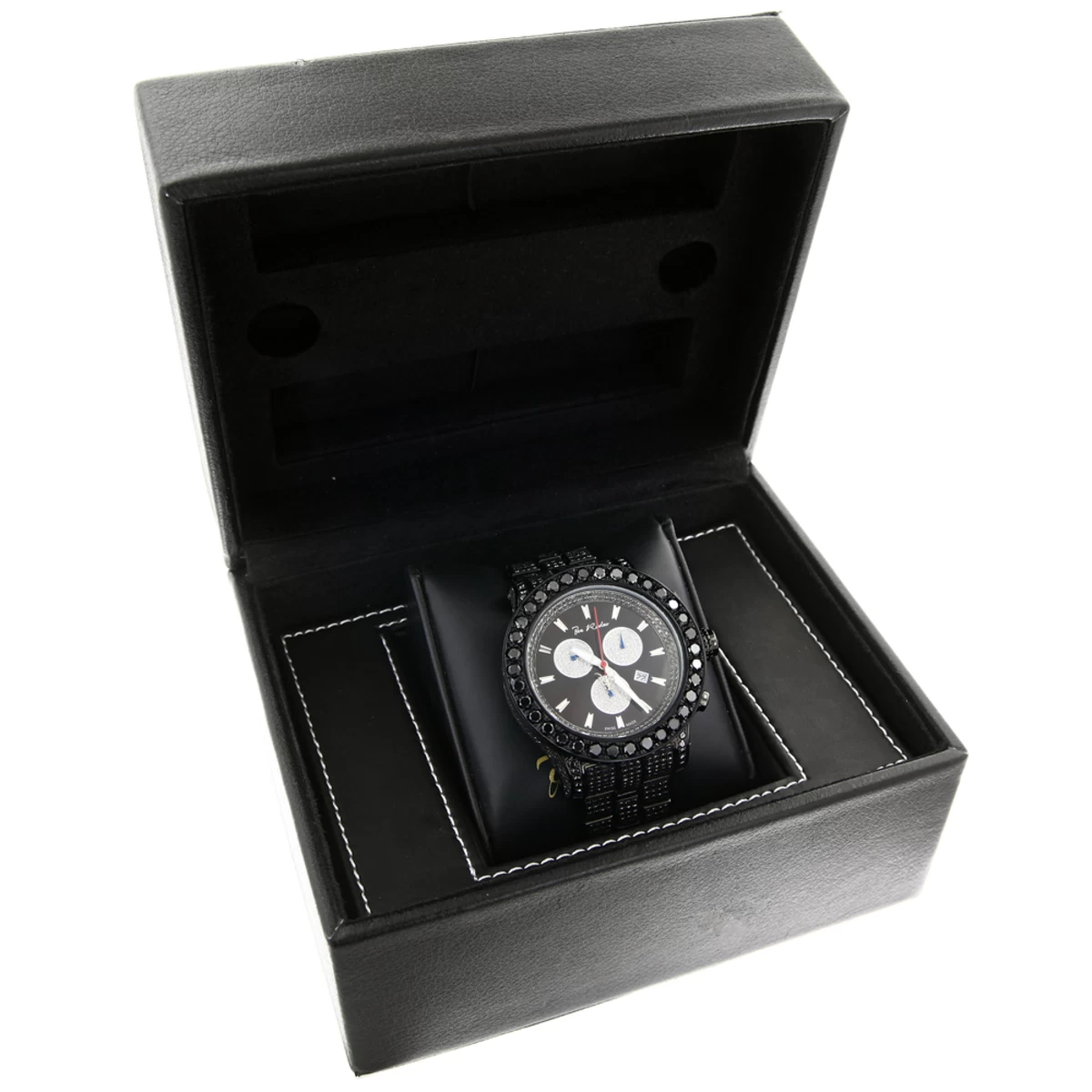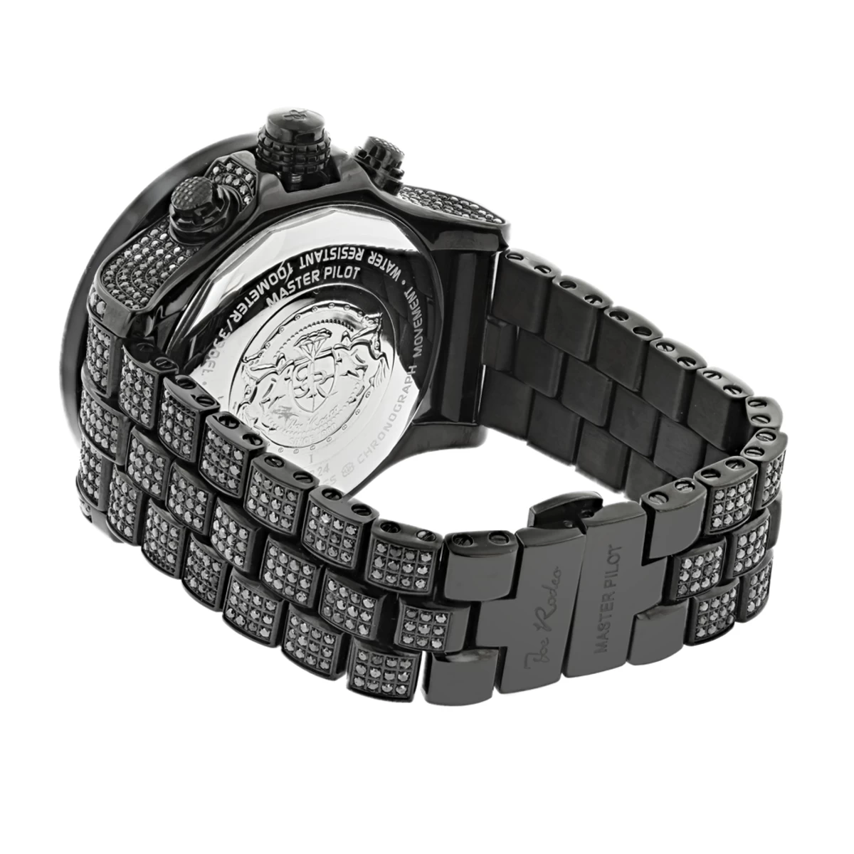 Hip-Hop Watches! This Custom Joe Rodeo Men’s Black Diamond Watch – Joe Rodeo Master Pilot edition features 36.7 carats of beautiful, fancy black diamonds on the customized bezel, sides and lugs of the black stainless steel case and band. This exquisite Joe Rodeo diamond watch for men showcases a black dial with three chronograph subdials paved in sparkling white stones, a date display window at the 4 o’clock position, and a 2-row of black stones around the dial, all protected by a scratch-free crystal glass. This luxurious men’s black diamond watch by Joe Rodeo is equipped with a super accurate Swiss-made chronograph quartz movement. The case is water-resistant to 100m (330 ft). 1 year manufacturer’s warranty.
