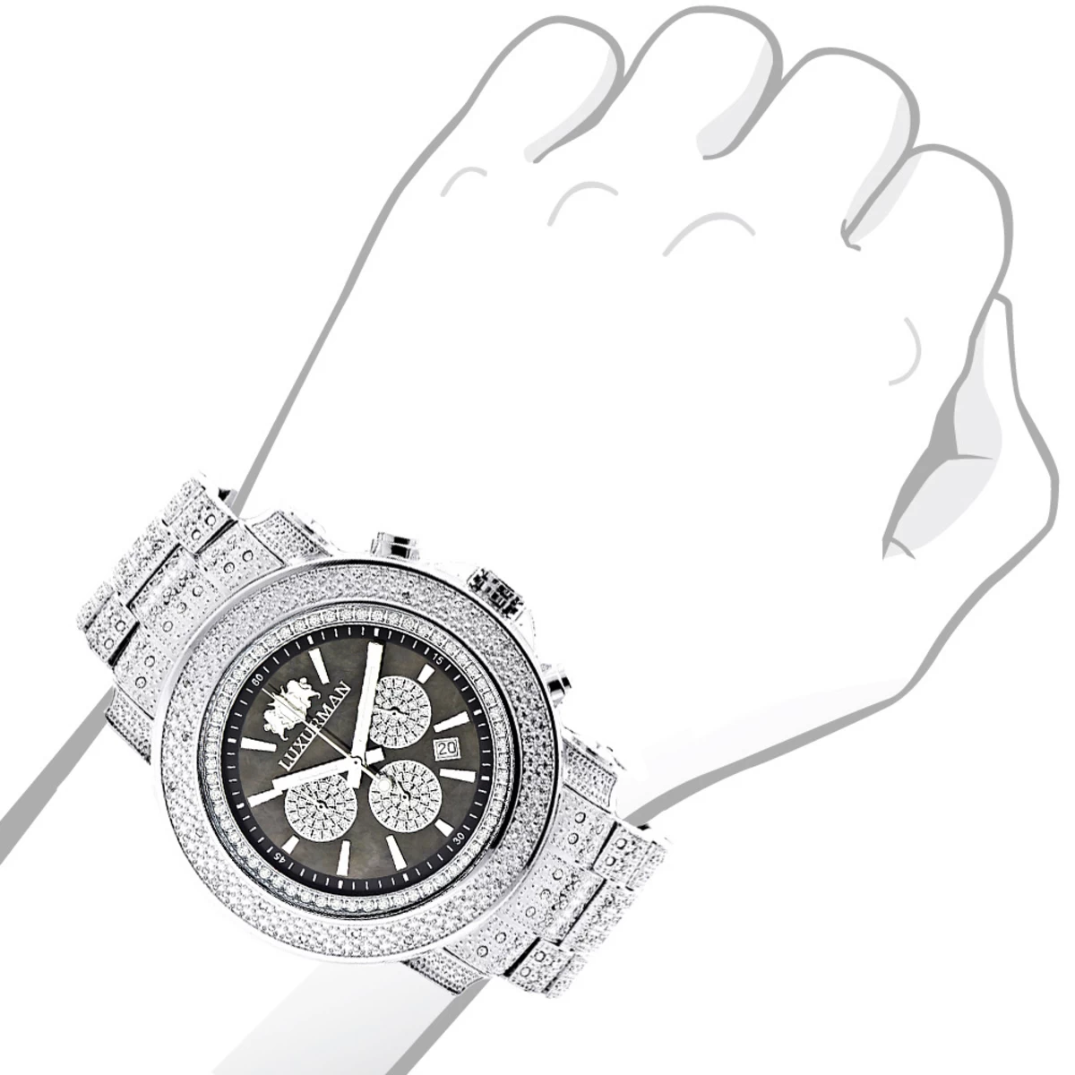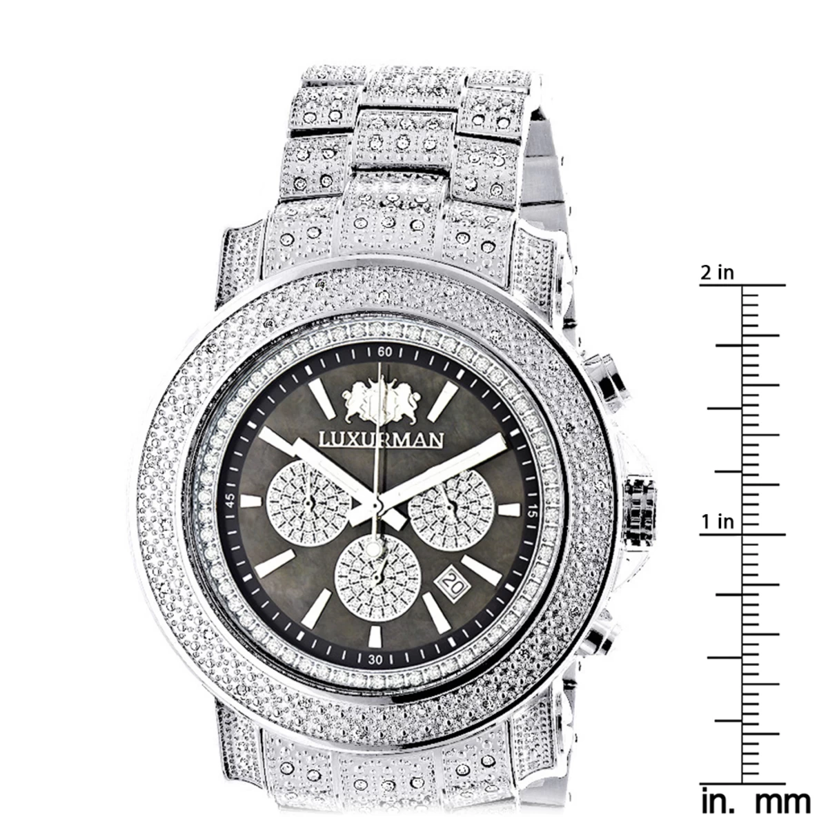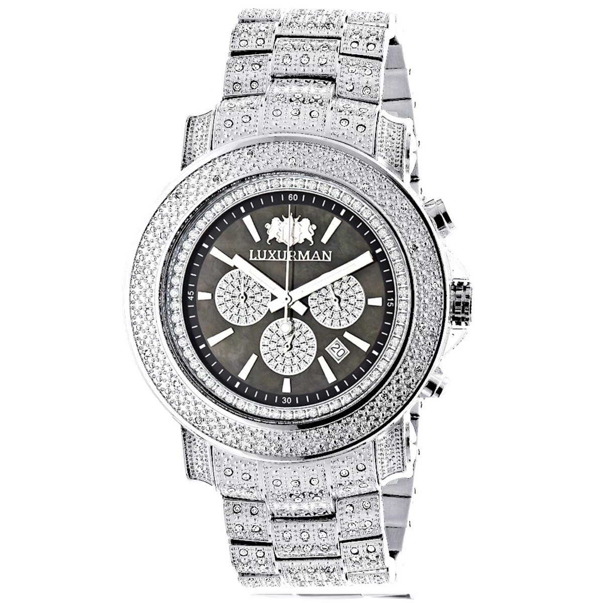 This Iced Out Men’s Diamond Watch Luxurman Escalade Oversized with Chrohograph showcases 2 carats of genuine diamonds and features a black mother of pearl dial accented with white sparkling stones with three chronograph subdials, a date display window, and a silver tone stainless steel bracelet with diamonds. This luxurious men’s diamond watch by Luxurman houses a fine Japan-made quartz movement and comes with two extra interchangeable leather straps in different colors (band colors may vary).
