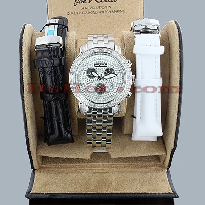 This Joe Rodeo Diamond Bezel Jojo Watch features 3.50 carats of round diamonds, a round polished stainless steel case, scratch-free crystal glass, individually numbered and engraved stainless steel case-back. Fine Swiss-made quartz movement with chronograph function, center second and date. Water-resistant to 100 meters. This Joe Rodeo watches collection piece comes with two interchangeable straps in different colors. The patented strap adjusts once for a perfect fit, and comes on and off with the press of a button.