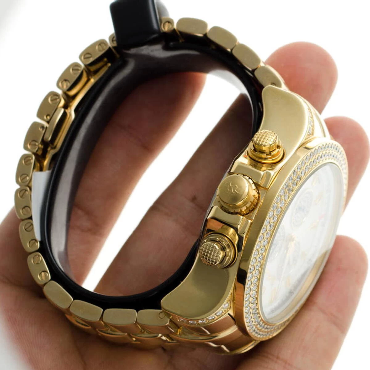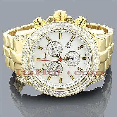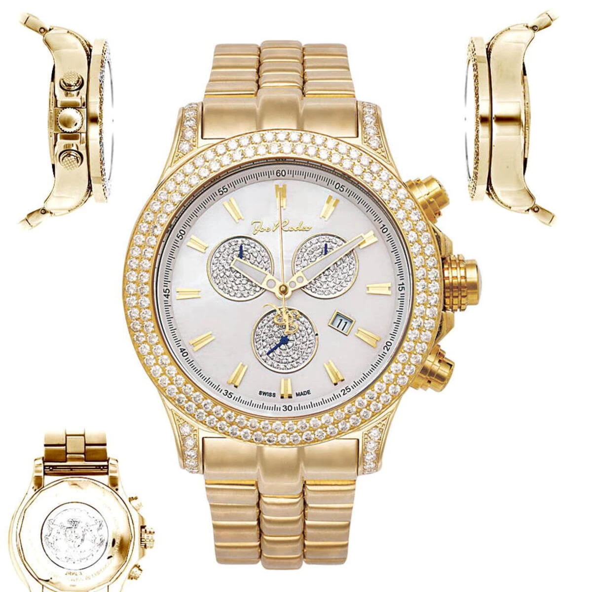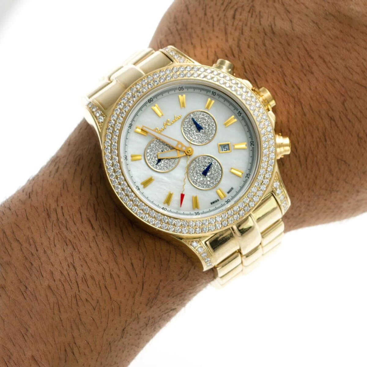 Luxurious Joe Rodeo Diamond Watches! This Master Pilot Men’s Watch features 7.00 carats of sparkling white diamonds on the bezel, lugs of the yellow gold tone stainless steel case and the yellow gold tone stainless steel band. This exquisite Joe Rodeo diamond watch showcases a white mother of pearl dial with three chronograph subdials paved in sparkling white diamonds and a date display window at the 4 o’clock position, all protected by a scratch-free crystal glass. This luxurious men’s diamond watch by Joe Rodeo is equipped with a super accurate Swiss-made chronograph quartz movement. The case is water-resistant to 100m (330 ft).