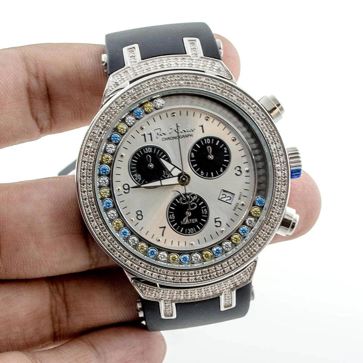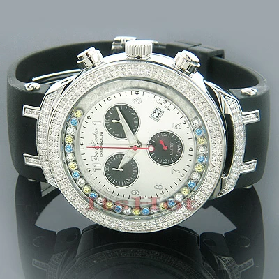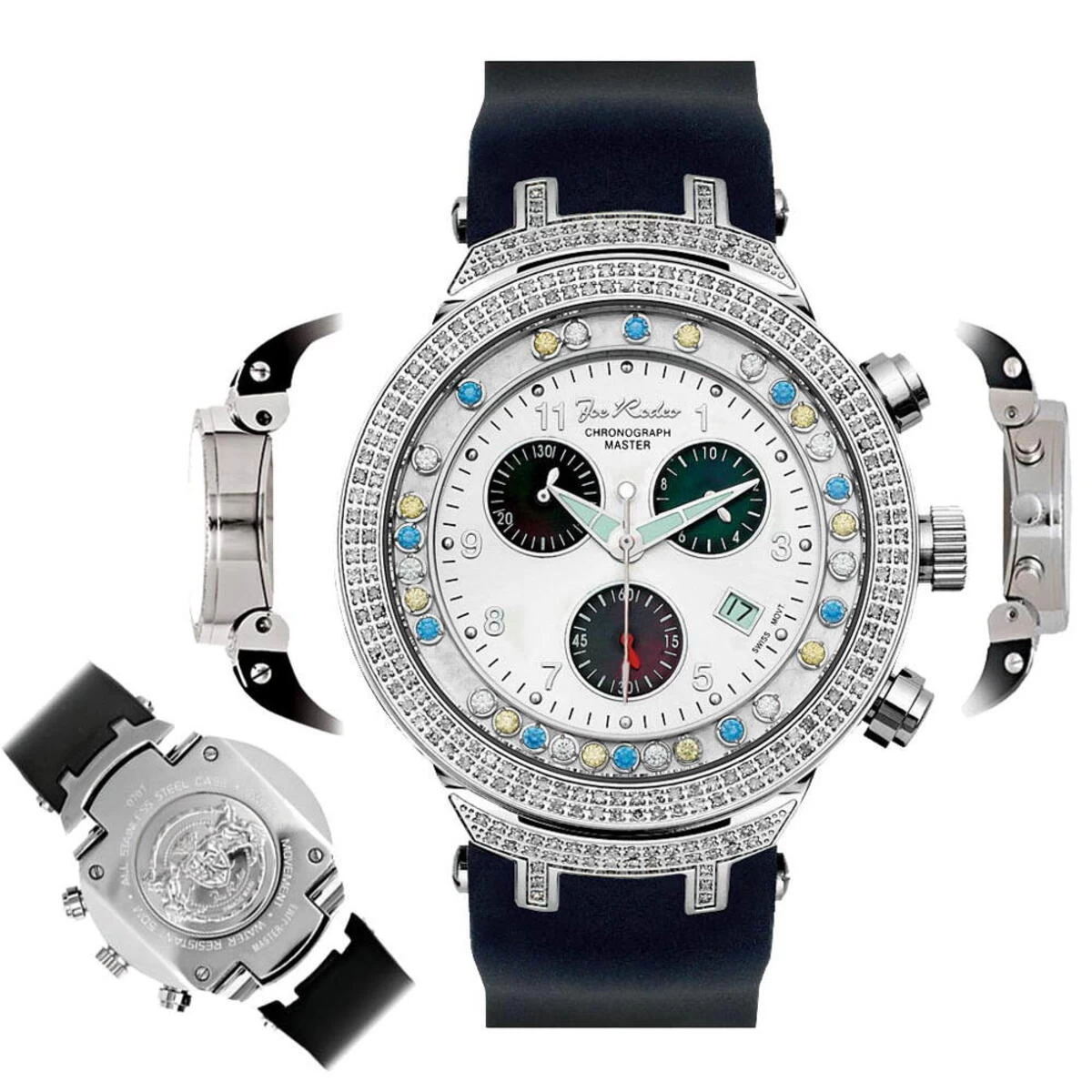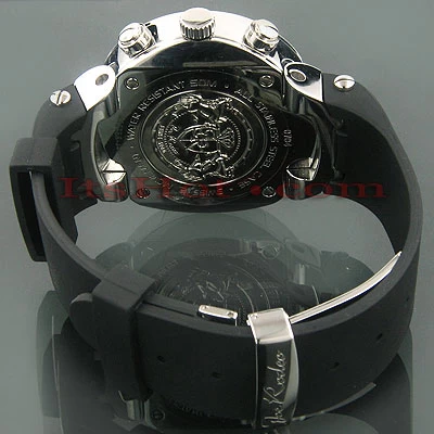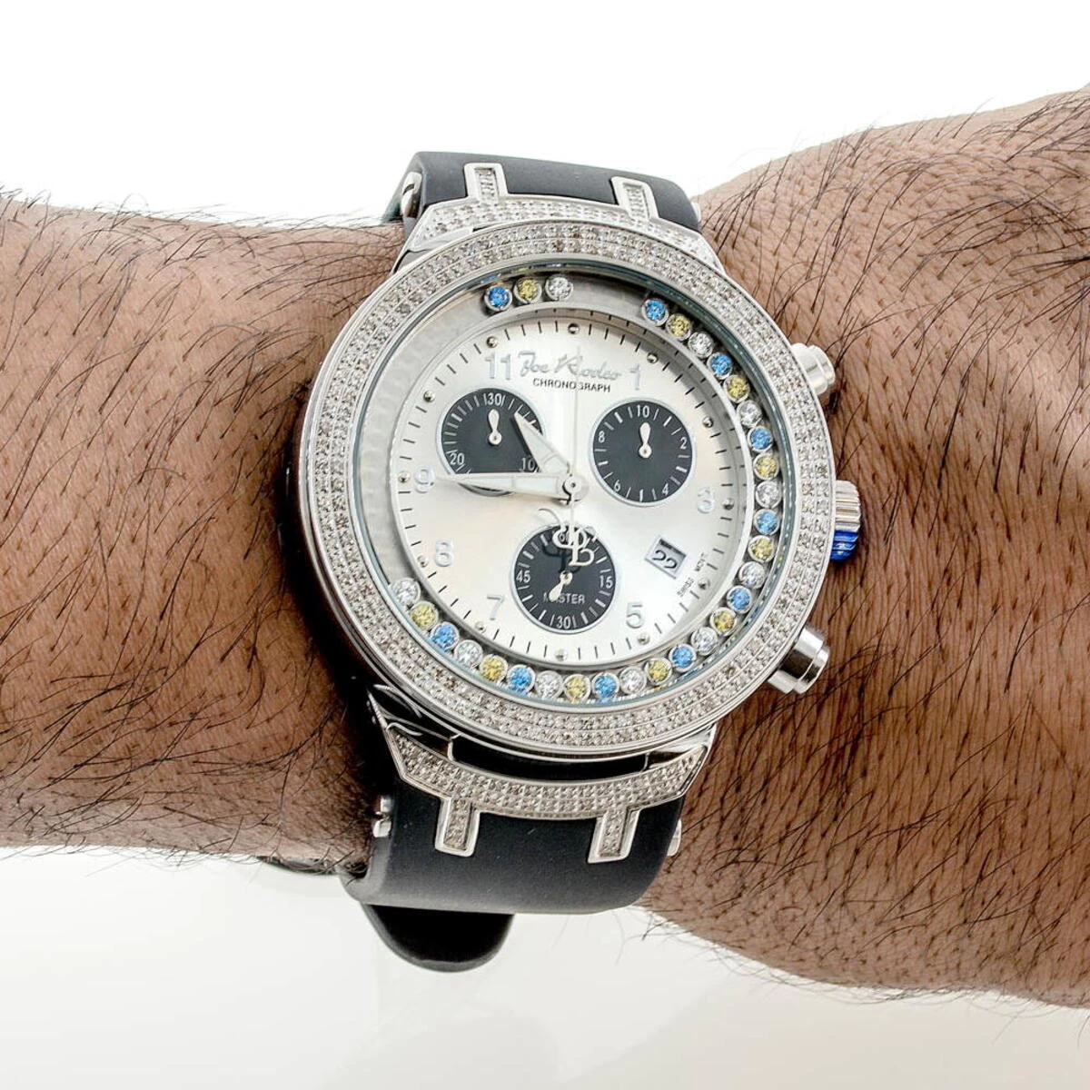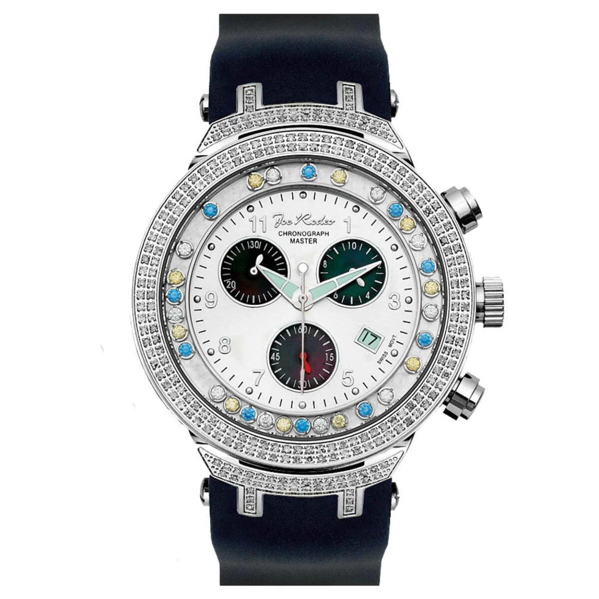 This Joe Rodeo JoJo Master Diamond Watch features 2.20 carats of genuine diamonds on the bezel and lugs of the round polished silver stainless steel case and plain black rubber strap with a butterfly clasp. This men’s diamond watch is equipped with a fine Swiss-made quartz chronograph movement with date indicator. The watch comes with two interchangeable rubber bands in different colors. The patented strap adjusts once for a perfect fit, and comes on and off with the press of a button.