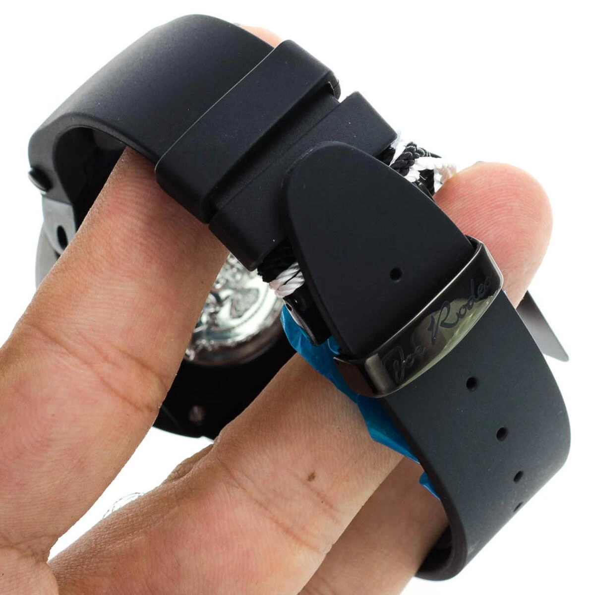 This Joe Rodeo Master Men’s Diamond Watch features 2.20 carats of diamonds masterfully set on the bezel and lugs of the black tone stainless steel case. This Joe Rodeo diamond watch showcases a black mother of pearl dial with three chronograph subdials, a date window at the 4 o’clock position and a row of white glistening stone around the dial. This trendy men’s watch comes with two interchangeable rubber straps in different colors. The patented strap adjusts once for a perfect fit, and comes on and off with the press of a button.