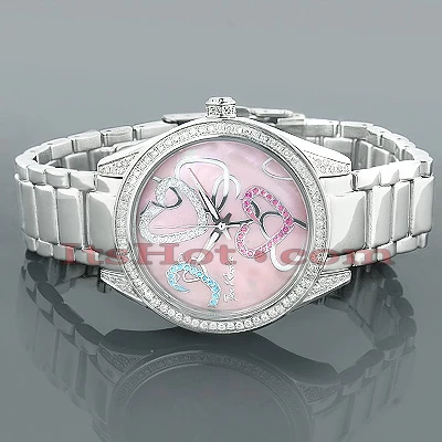 This Joe Rodeo Secret Heart Ladies Diamond Watch features 1.60 carats of genuine diamonds, a polished silver tone stainless steel case and pink Mother of Pearl dial paved in pink, white and blue stones. Clear diamonds sparkle on the bezel and lugs of this beautiful watch with an accurate quartz Swiss-made movement. This fabulous Joe Rodeo ladies diamond watch comes with two extra interchangeable bands in different colors. Water-resistant 100m (330 ft).
