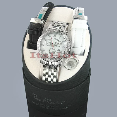 This classic JoJo Joe Rodeo men’s diamond watch features 1.75 carats of diamonds, a polished stainless steel case, scratch-free crystal glass, individually numbered and engraved stainless steel case-back. This watch features diamonds on the bezel and on the lugs. Super accurate Swiss-made quartz movement with chronograph function. This fine diamond watches collection piece by Joe Rodeo comes with two extra interchangeable bands in different colors. Water-resistant 100m (330 ft).