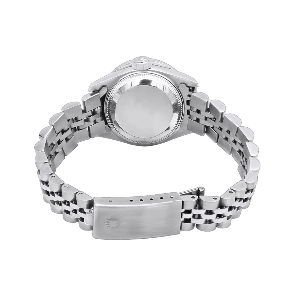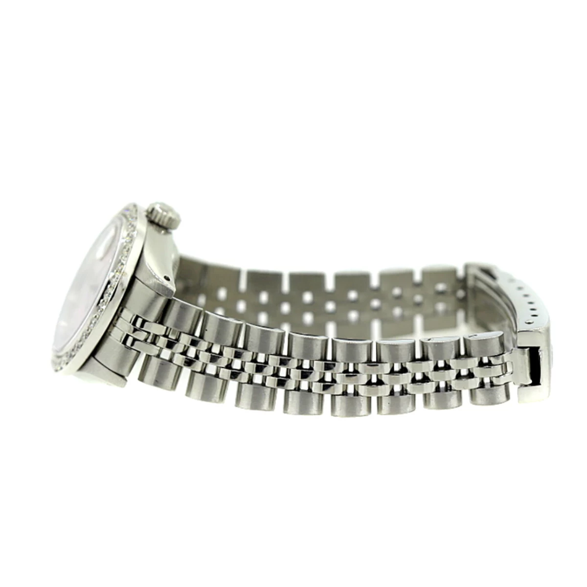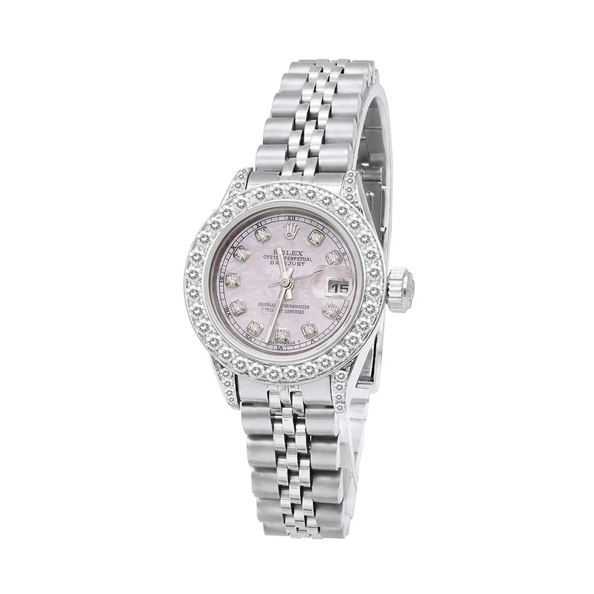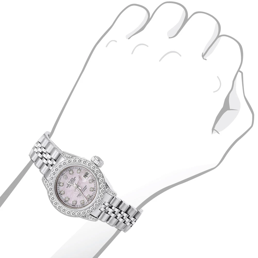 From our women’s diamond watches collection: this ladies diamond Role Datejust watch Oyster Perpetual 26mm model features pink MOP dial with diamond indices, diamond bezel and diamonds on the lugs, total 2 carats of sparkling diamonds, a brushed stainless steel case, and a stainless steel band. This Rolex Ladies Diamond Watch showcases a pink mother of pearl dial and a date display at the 3 o’clock position. Please note: this custom Rolex diamond watch is pre-owned, in like new condition, and comes with a 5-year warranty from ItsHot.com.