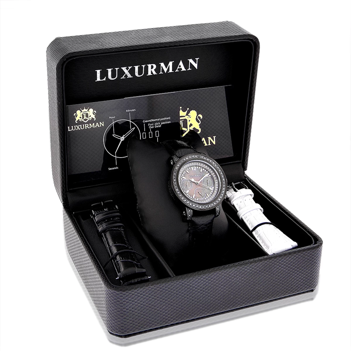 Unique Luxurman Watches: This Black Diamond Watch for women showcases 2.15 carats of sparkling black diamonds. This Luxurman diamond watch features a black mother of pearl dial paved with sparkling stones and three subdials, a black tone stainless steel case and a black genuine leather band.