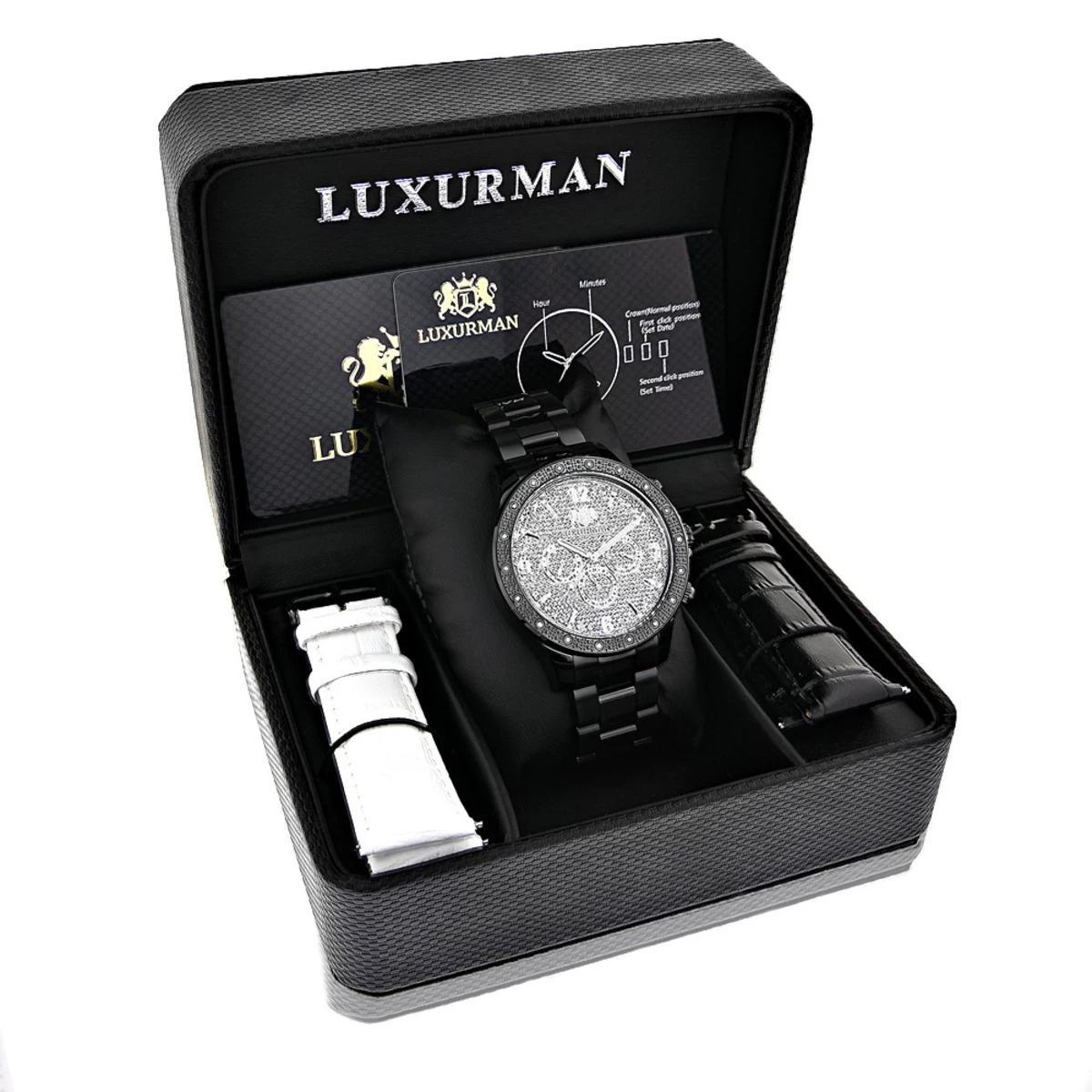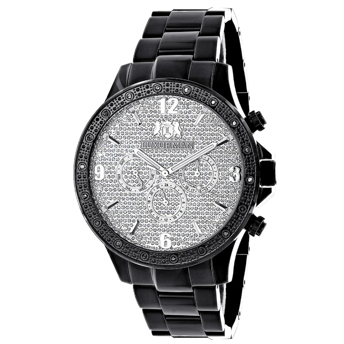 This Luxurman Liberty Black Diamond Watch For Men features Swiss Movement, 1/4 carats of genuine diamonds and a classic design. This men’s diamond watch showcases a dial with Date/Calendar/24 hours subdials and a black tone stainless steel case and band; it comes in full retail packaging with two interchangeable extra leather straps in different colors and a top industry warranty of 5 years. This Luxurman Diamond Watch for Men makes a perfect gift for any occasion.