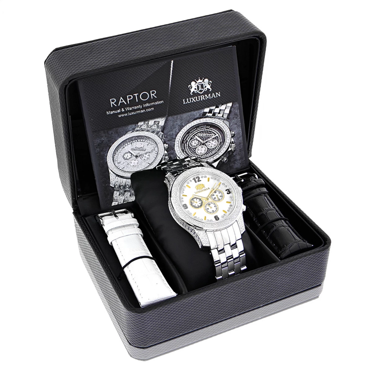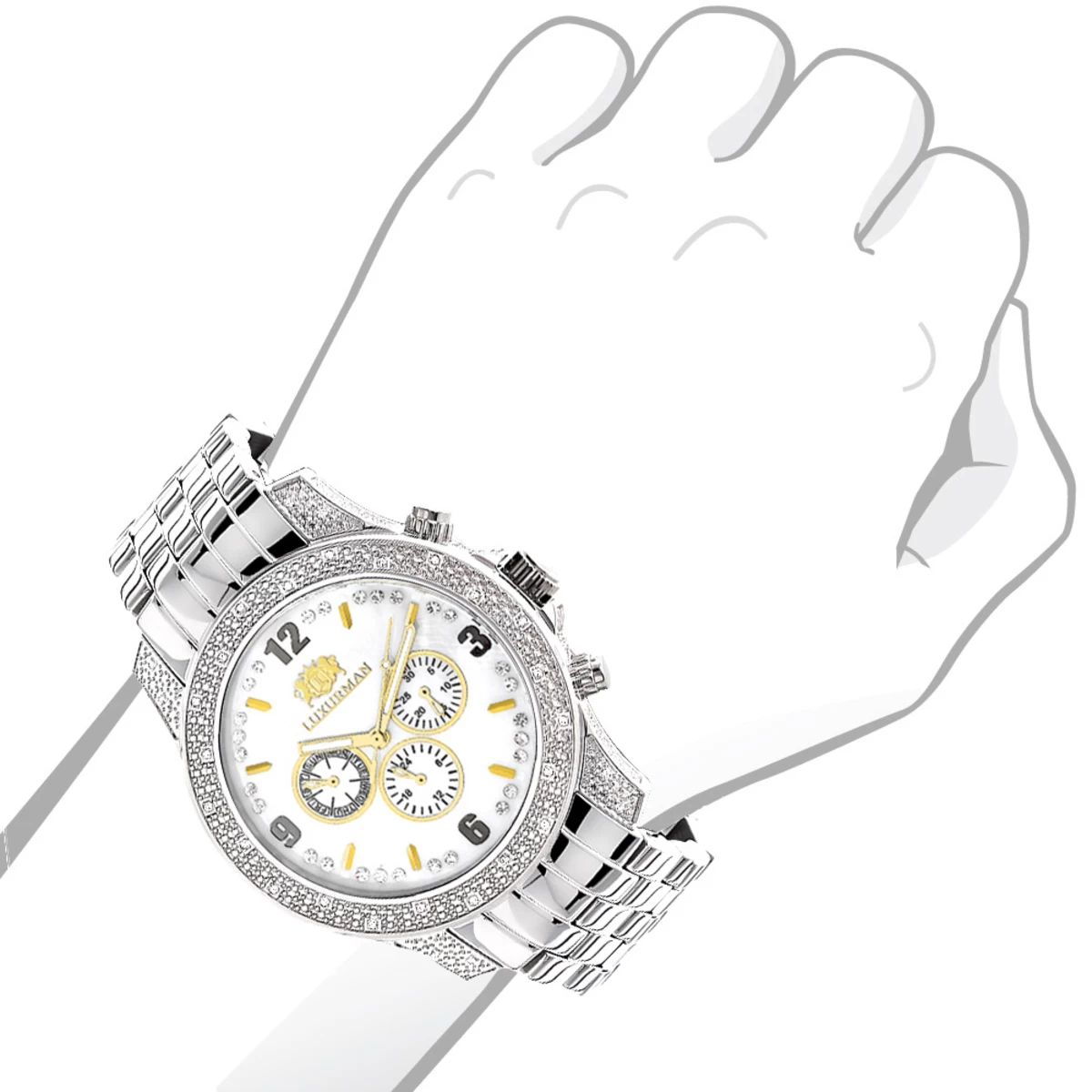 Designer Luxurman Watches! This Men’s Diamond Watch by LUXURMAN features 0.50 carats of genuine diamonds masterfully set on the bezel, sides and lugs of this silver tone stainless steel watch. The face of this LUXURMAN diamond wrist watch showcases three white mother of pearl chronograph subdials and a date display at 4 o’clock. This men’s diamond watch is water-resistant to 30 m (110 ft), and makes a great gift for any occasion.