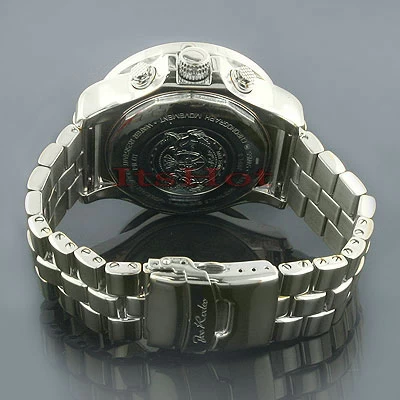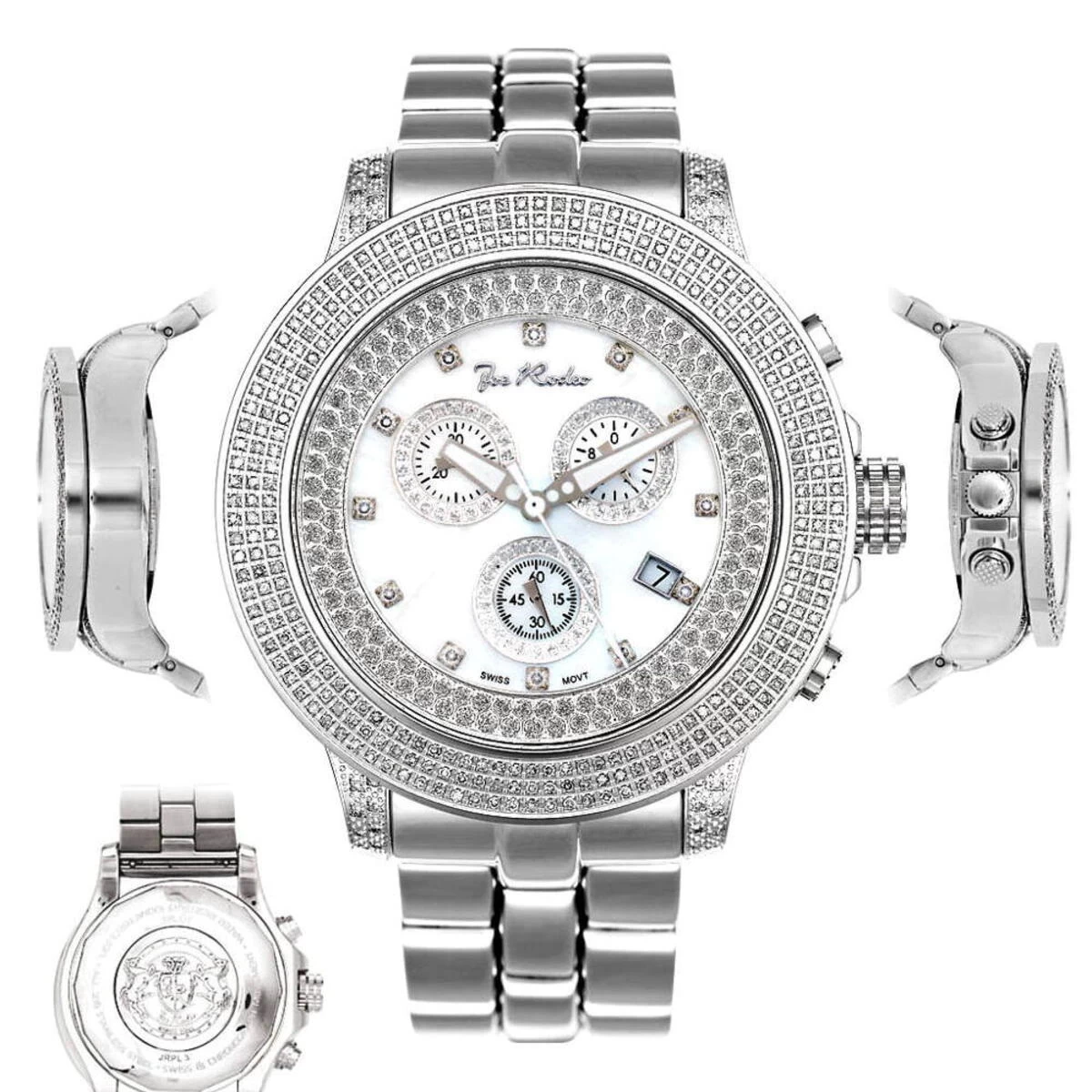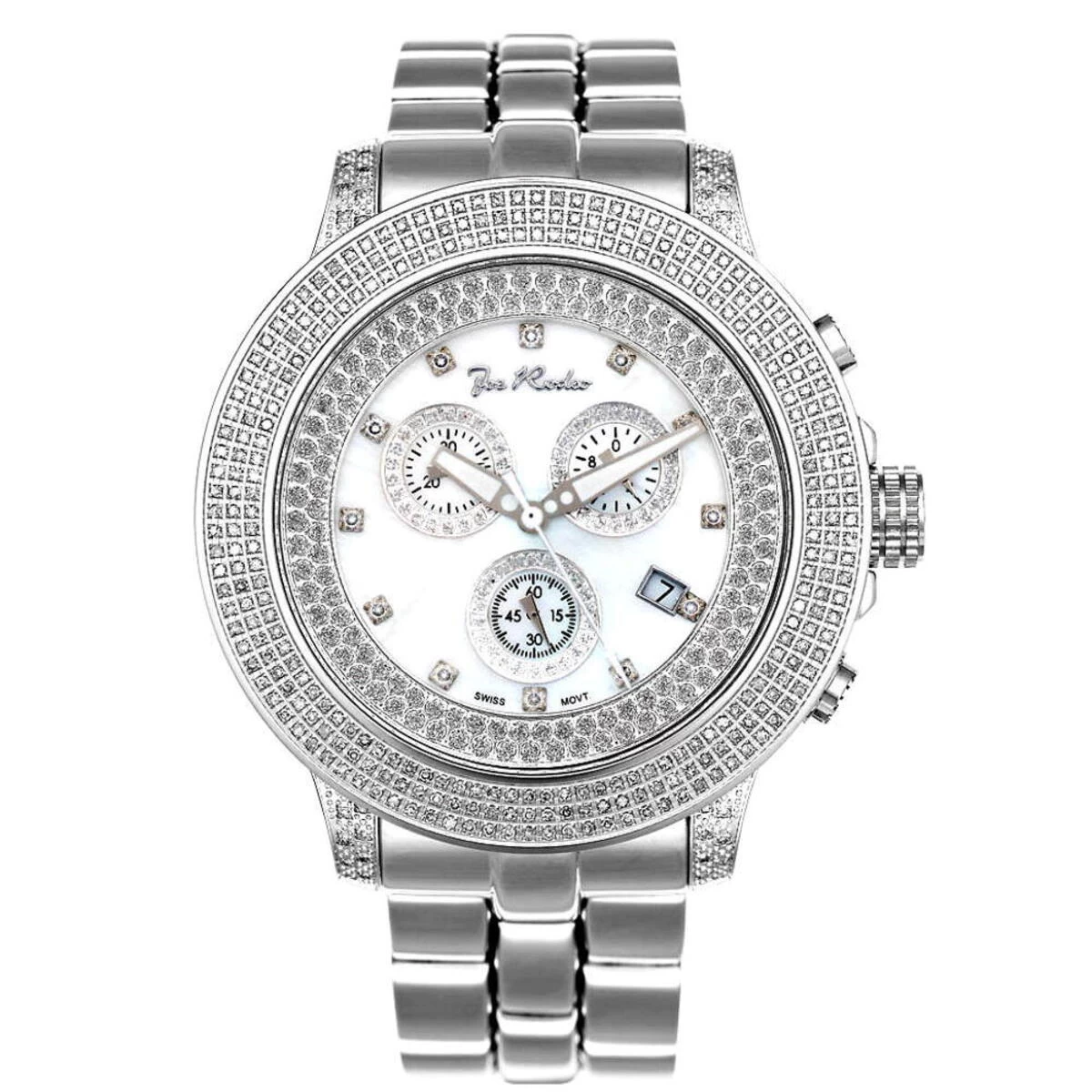 Affordable Luxury Watches! This Joe Rodeo Pilot Men’s Diamond Watch has a huge 52mm silver gold stainless steel case with 3.15 ct. of round sparkling diamonds set on its bezel and lugs. The white mother of pearl face has three chronograph subdials, a date display window at 4 o’clock position and glistening white stones set as hour markers. This men’s diamond wrist watch is equipped with a super accurate Swiss-made chronograph quartz movement. The case is water-resistant 100m (330 ft).
