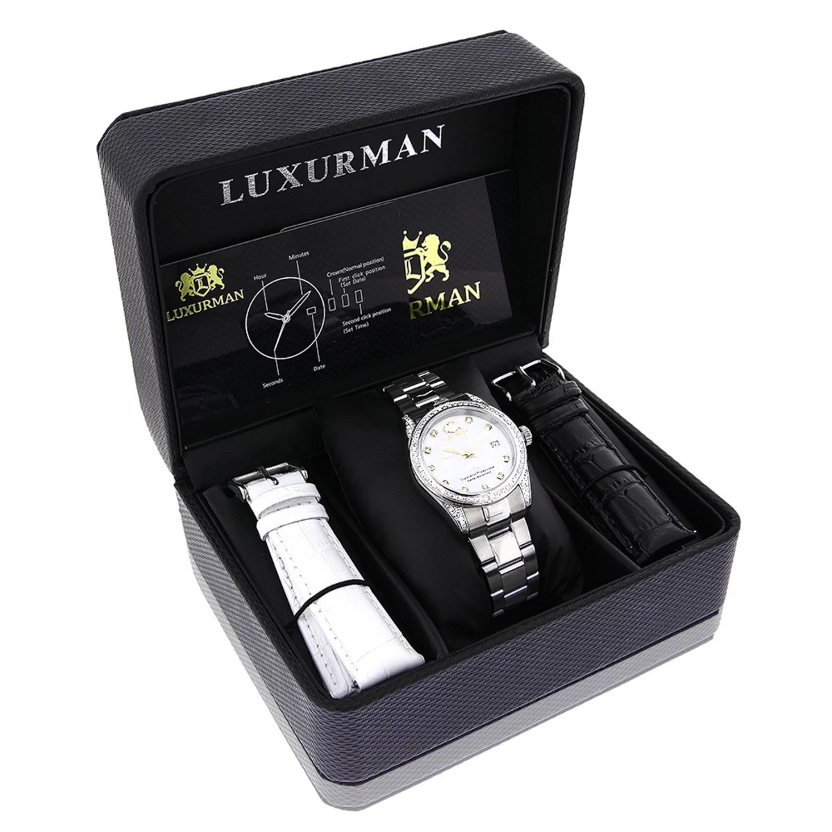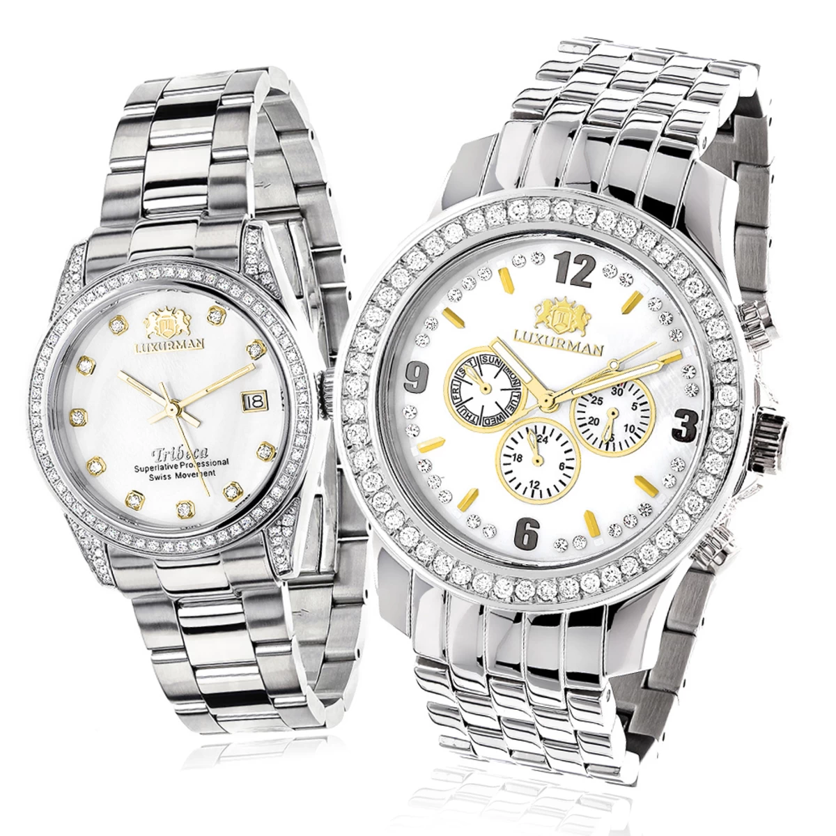 The Luxurman Tribeca Diamond Watch for Her features 1.5 carats of genuine diamonds, this ladies diamond watch has Swiss movement, white mother of pearl dial and a date display window at a 3 o’clock position. The Luxurman Raptor Diamond Watch for Him showcases 2.5 carats of genuine diamonds, white mother of pearl face with three subdials, a white gold plated stainless steel case and stainless steel band. Giving your partner a Luxurman Diamond Watch will surely garner their attention and ensure that you are both at the leading edge of fashion as you go out together. If not now, then when?