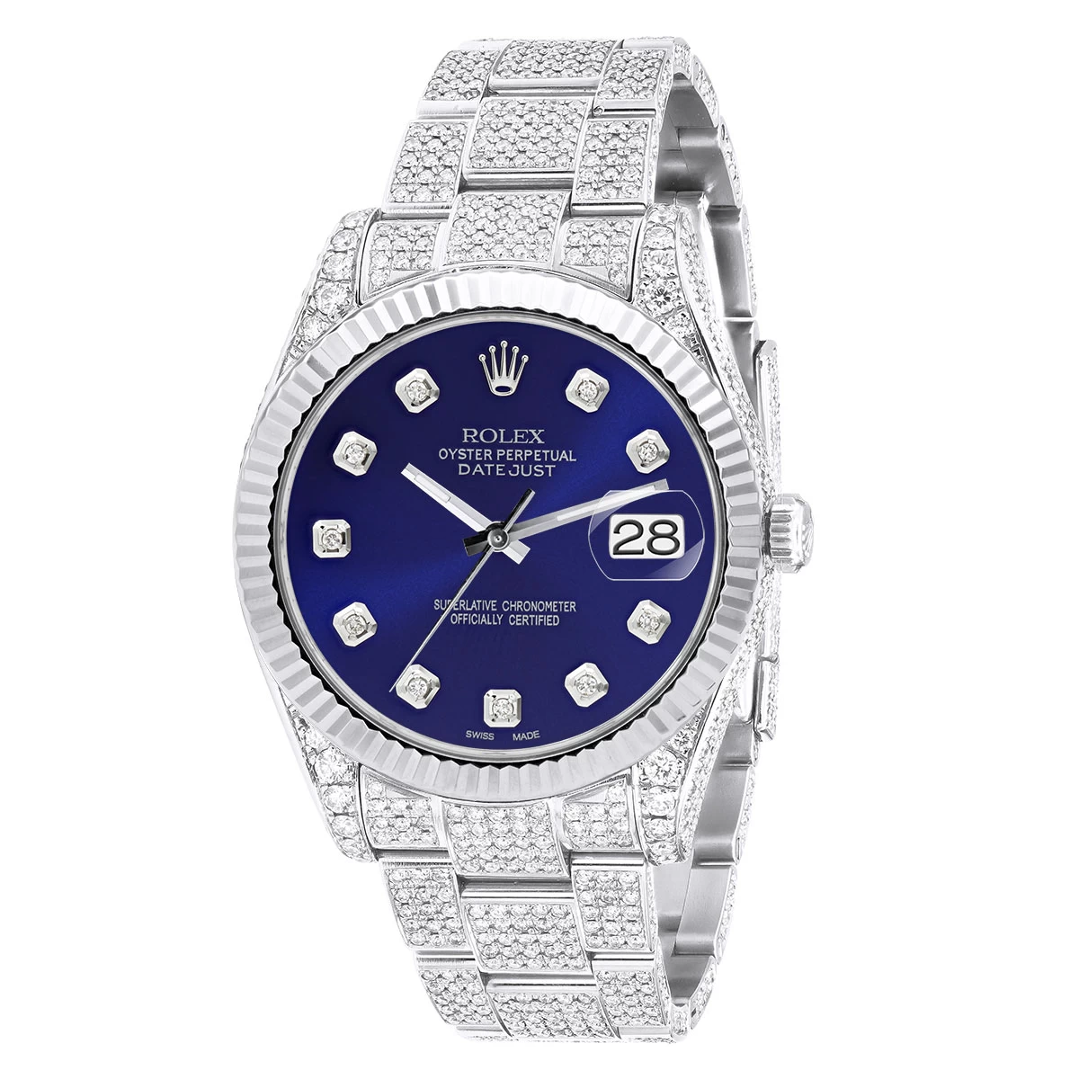 Men’s Diamond Iced Out Watch Rolex Datejust 41mm Dark Blue Dial Oyster Bracelet. This diamond Rolex watch is pre-owned, in excellent condition, and comes in a Rolex box with a full warranty from ItsHot. Customize the look of the watch if you prefer with diamond bezel or fluted bezel. Each watch can be additionally customized with diamonds on the case as well as band (please contact us for details).