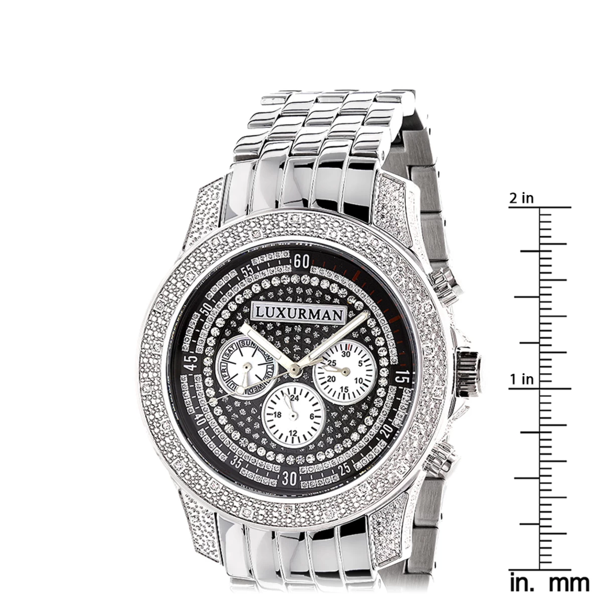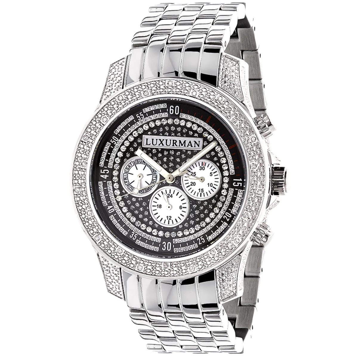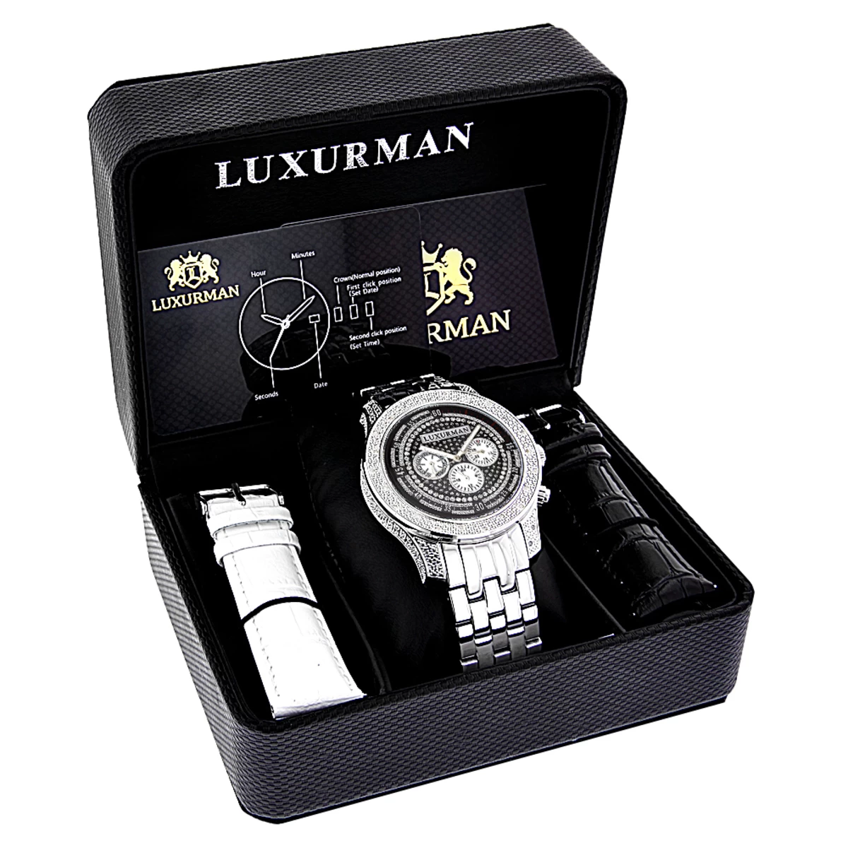 This Men’s Diamond Watch by Luxurman features 0.50 carats of sparkling diamonds on the sides, lugs and bezel of the silver tone stainless steel case. This Luxurman diamond watch showcases a dial paved in white stones with Date/Calendar/24 hours subdials, numeric second/minute positions around the dial and a silver tone stainless steel band. This men’s diamond watch by Luxurman comes with two interchangeable straps in different colors and makes a perfect present for any occasion.