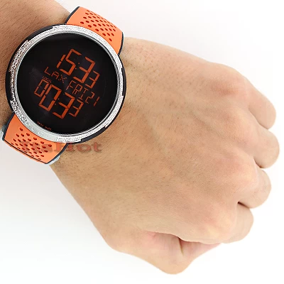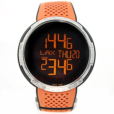 Gucci Sport Edition Men’s Diamond Watch with a custom made bezel features 2.8 carats of sparkling round diamonds around the stainless steel case, a scratch-resistant sapphire crystal, an orange rubber band, and a digital dial code. This custom diamond Gucci watch showcases a fine Swiss-made quartz movement .