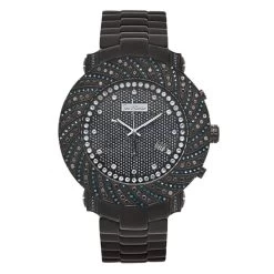 Unique Men’s Joe Rodeo Watches: This Blue Black Diamond Watch – Joe Rodeo Junior – features 4.25 carats of sparkling black and blue diamonds on the bezel and lugs of the black stainless steel case; and the stainless steel band. This exquisite Joe Rodeo diamond watch showcases a dial paved in white sparkling stones with a second, 30-minute, 1/8 of a second chronograph subdials, a date display window at the 4 o’clock position, and a row of white stones around it. This luxurious men’s diamond watch by Joe Rodeo is equipped with a super accurate Swiss-made chronograph quartz movement. The case is water-resistant to 100m (330 ft).