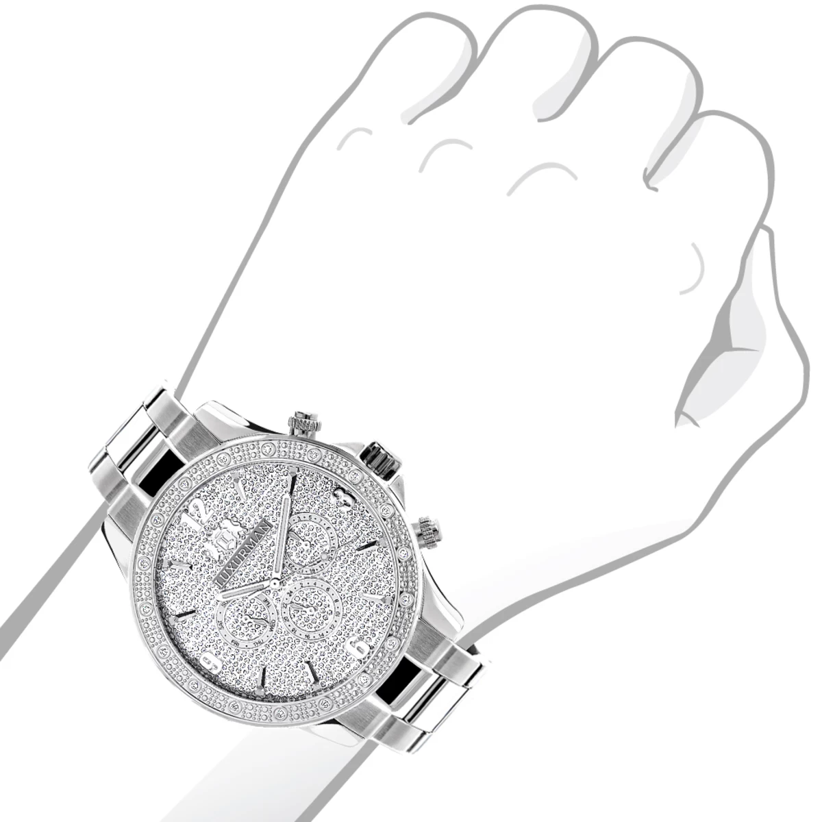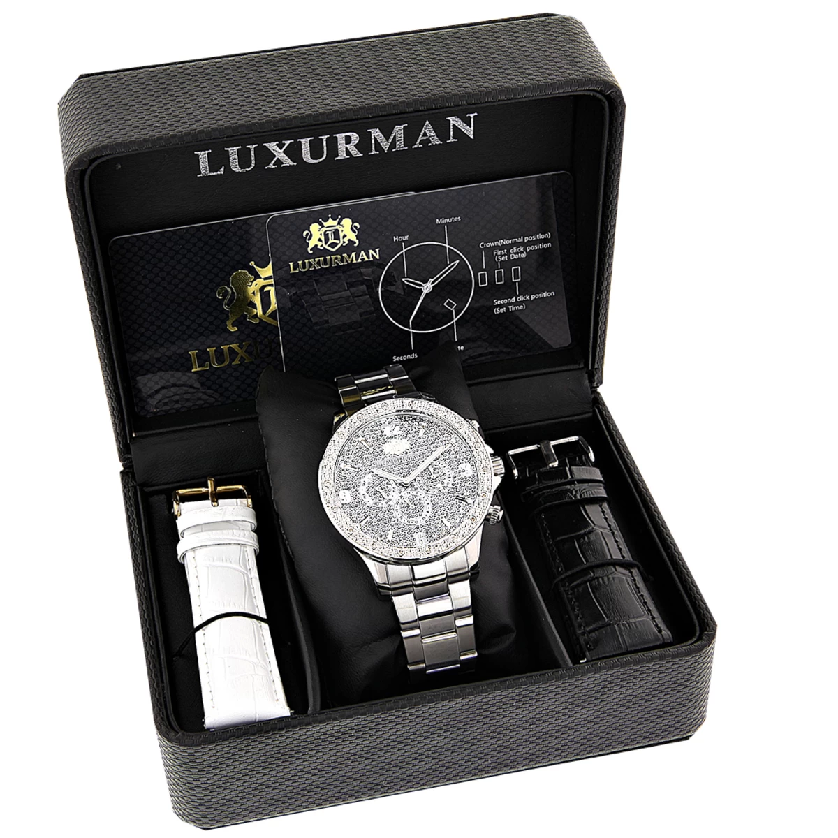 This Men’s Real Diamond Watch by Luxurman Liberty features 0.2 carats of sparkling round diamonds, Swiss movement and stainless steel band. This Luxurman men’s diamond watch showcases a dial with Date/Calendar/24 hours subdials paved in sparkling stones, and a silver tone stainless steel band and case. This designer men’s diamond watch by Luxurman comes in retail box with two extra interchangeable straps in different colors (black and white ) and is backed by 5 year factory warranty. This Luxurman Diamond watch makes a perfect present for any occasion.