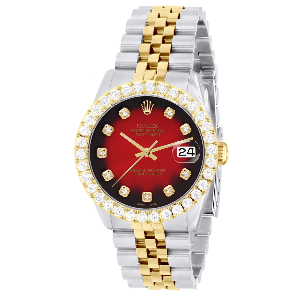 Men’s Watch Rolex Datejust 36mm Dark Red Dark Dial Jubilee Bracelet Diamond 4ct Bezel. This diamond Rolex watch is pre-owned, in excellent condition, and comes in a Rolex box with a full warranty from ItsHot. Customize the look of the watch if you prefer with diamond bezel or fluted bezel. Each watch can be additionally customized with diamonds on the case as well as band (please contact us for details).