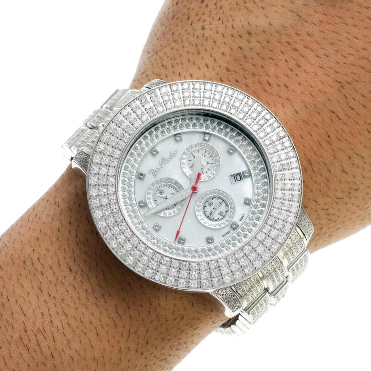 Oversized Iced Out Watches! This Joe Rodeo Pilot Men’s Diamond Watch features a huge 55mm silver gold stainless steel case with 11 carats of sparkling round diamonds set on its bezel, lugs and the band, white mother of pearl face has three chronograph subdials, a date display window at 4 oclock position and glistening white stones set as hour markers. This Joe Rodeo Pilot watch is equipped with a super accurate Swiss-made chronograph quartz movement and is water-resistant to 100m (330 ft).
