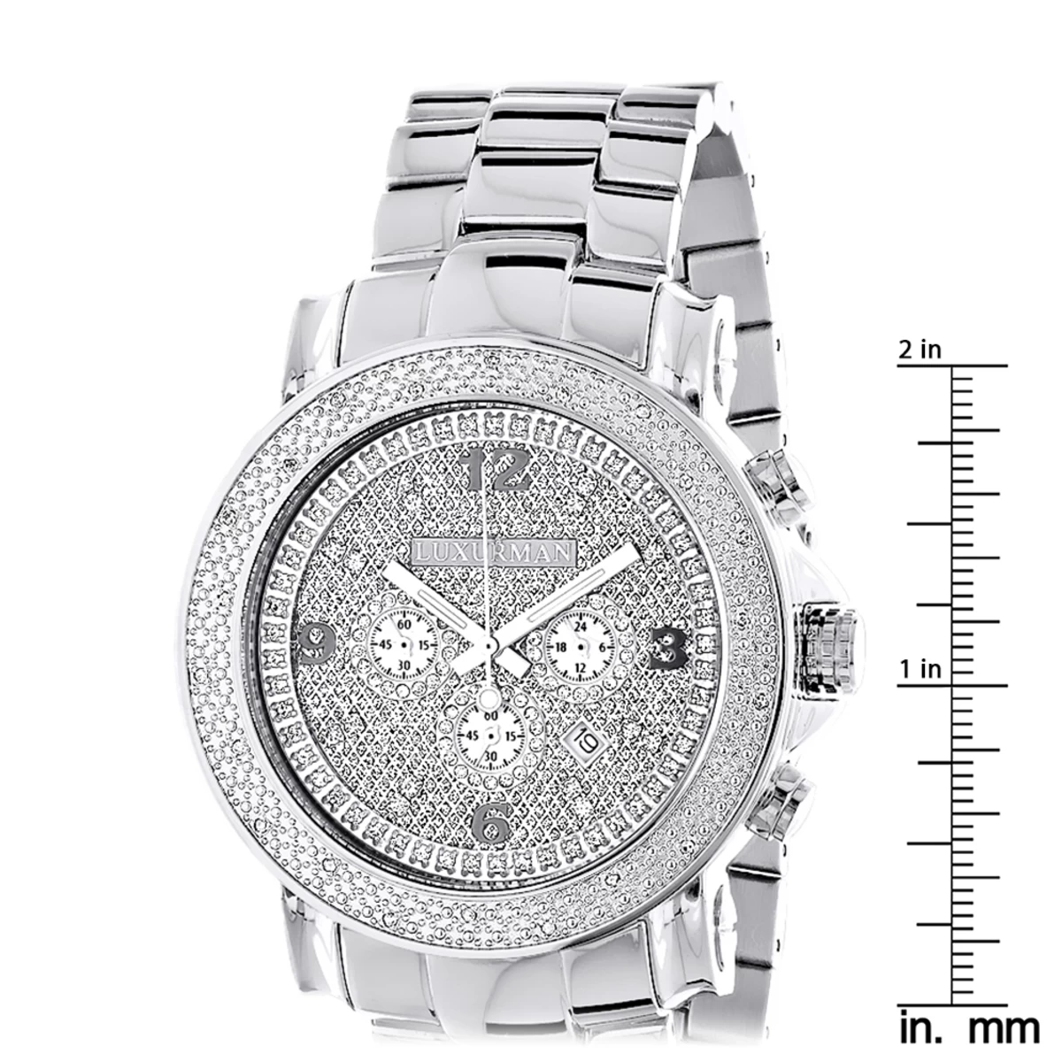 This Oversized Men’s Diamond Watch Luxurman Escalade with Chronograph showcases 0.25 carats of genuine diamonds. Features a dial paved in sparkling stones with three white mother of pearl chronograph subdials, a date display window at the 4 oclock position, and a silver tone stainless steel bracelet. This luxurious men’s diamond watch by Luxurman houses a fine Japan-made quartz movement and comes with two interchangeable straps in different colors (band colors may vary).