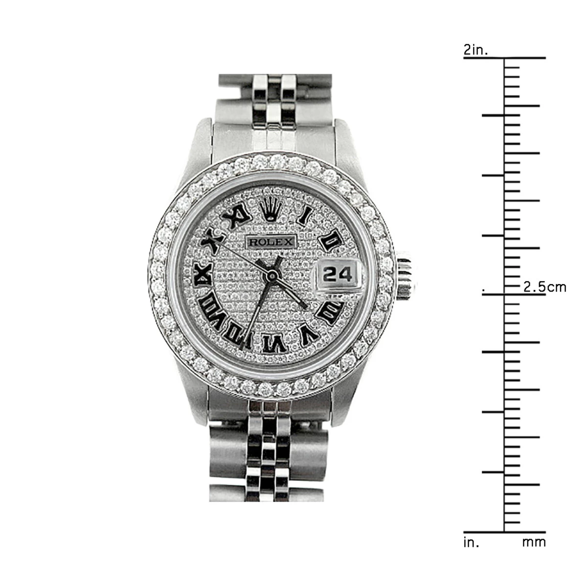 From our women diamond watches and iced-out Rolex watches collections This eye-catching Rolex Datejust Iced Out Diamond Watch for Women Stainless Steel features 2.5 carats of sparkling round cut genuine diamonds, a brushed stainless steel case, and a stainless steel band. This Rolex Ladies Diamond Watch showcases an amazing shining diamond dial and a date display at the 3 o’clock position. Please note: this custom Rolex diamond watch is pre-owned, in Like New condition, and comes with a 5-year warranty from ItsHot.com.