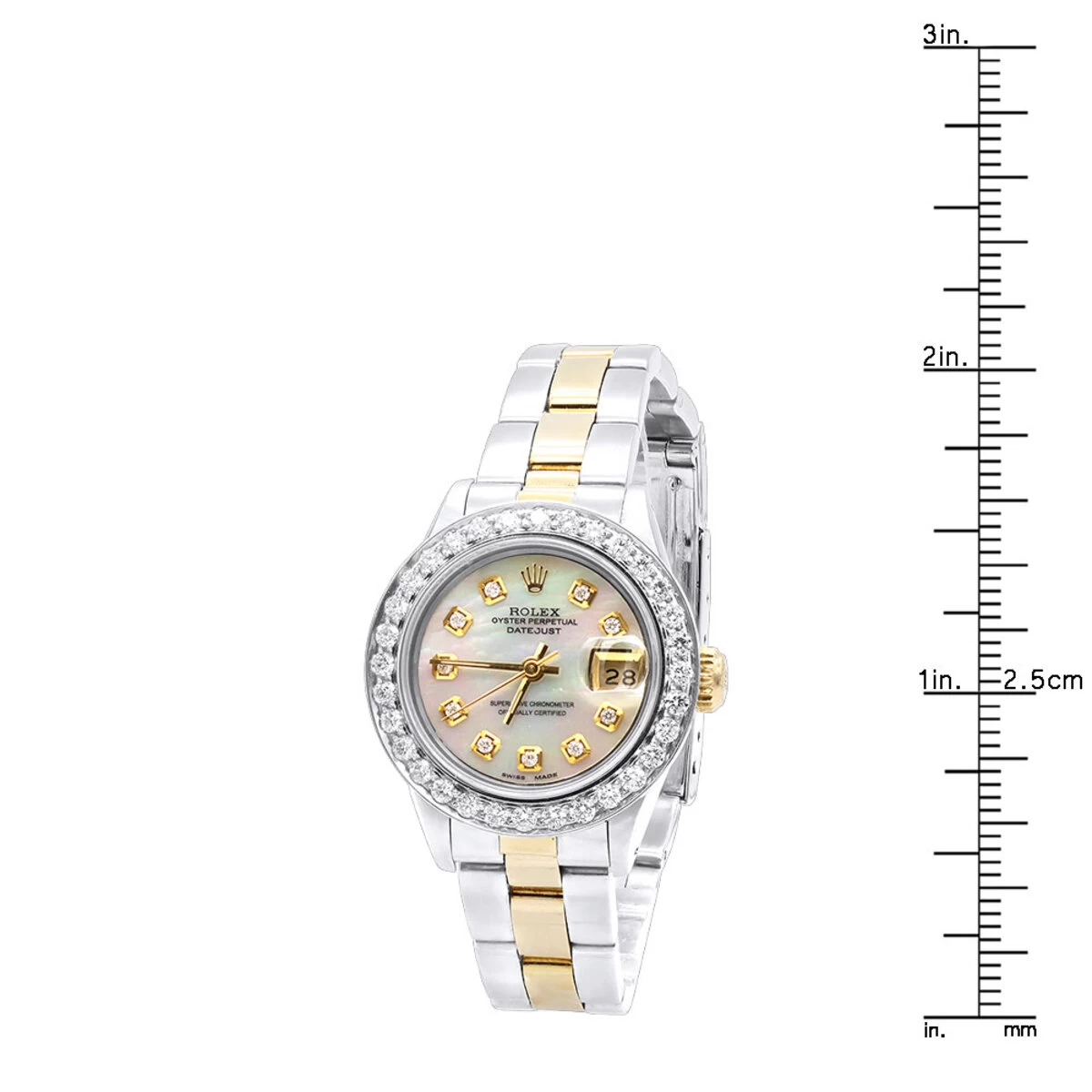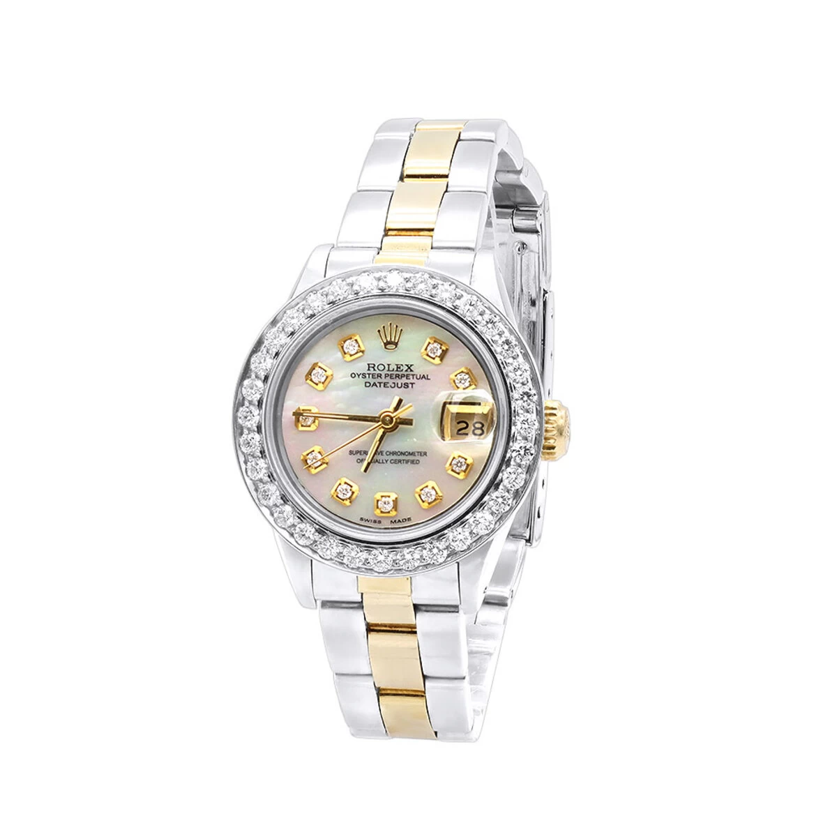 This Diamond Rolex Datejust 26mm Ladies Watch is a stunning timepiece that is sure to turn heads. This watch features a stainless steel case with a 26mm diameter and a bezel set with 2.5 carats of sparkling white diamonds. The bracelet is crafted from 18K yellow gold and stainless steel for a luxurious look and feel. The dial is made from mother of pearl and features gold-tone hands and white diamond markers with no numbers. The scratch-resistant dial window ensures that the watch will remain in pristine condition for years to come.
