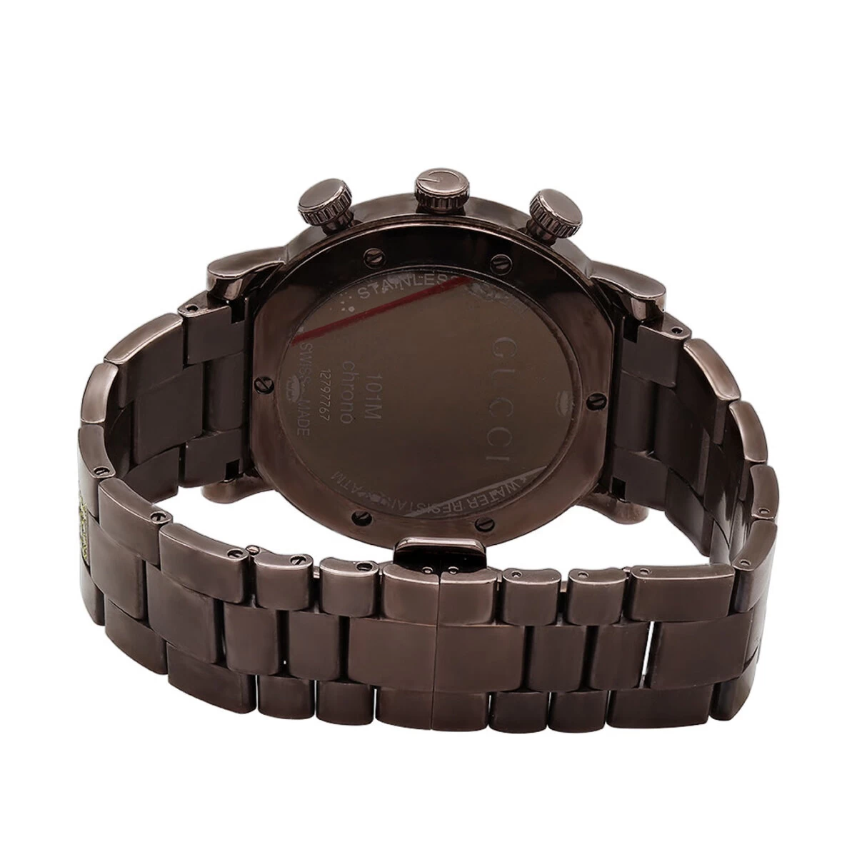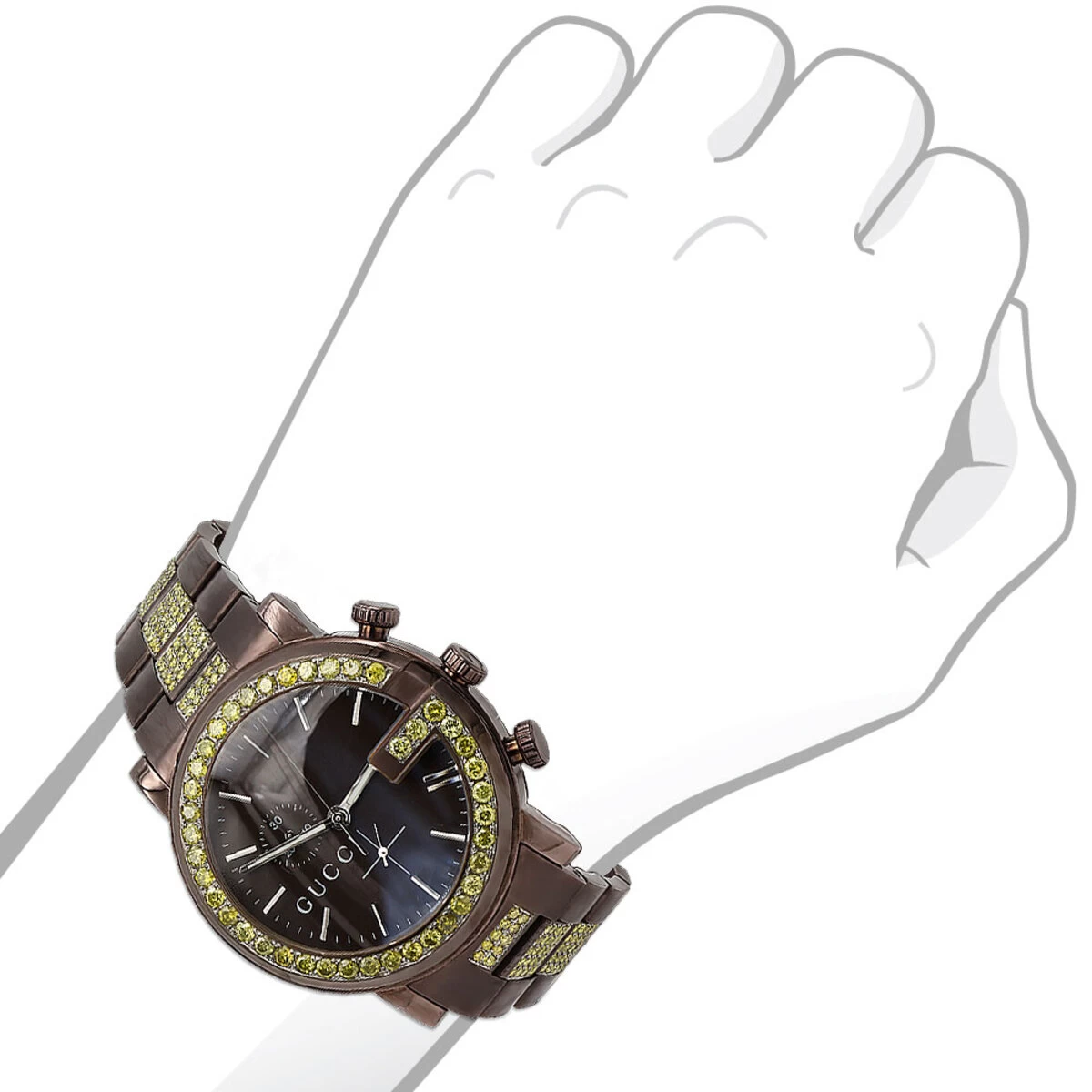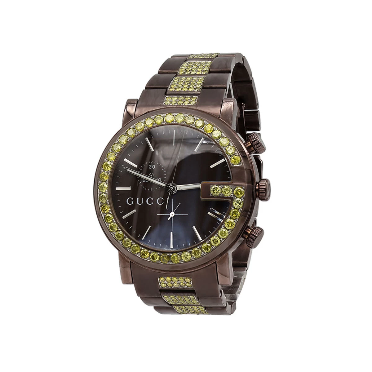 From our men’s diamond watches collection This extraordinary 6 Carat Diamond Gucci Watch for Men is 101M Chrono Modeln in Brown color, features a stylish dark brown polished stainless steel case and an array of marvelous dazzling yellow diamonds. Showcasing an intricate design and colour scheme that creates a captivating contrast of brown and yellow, this unique Gucci diamond watch for men has a classic black dial with silvery hour markers framed by a gorgeous bezel full of genuine yellow round cut diamonds. The matching band with yellow diamonds in the middle will be elegantly wrapping the wrist and possesses an eye catching brilliance. This men’s Gucci watch is also conveniently water resistant to 30 meters (100ft) and will make a great gift for a loved one or even yourself. The watch is in excellent condition and comes in an original box with a full 1 year warranty from ItsHot.com.