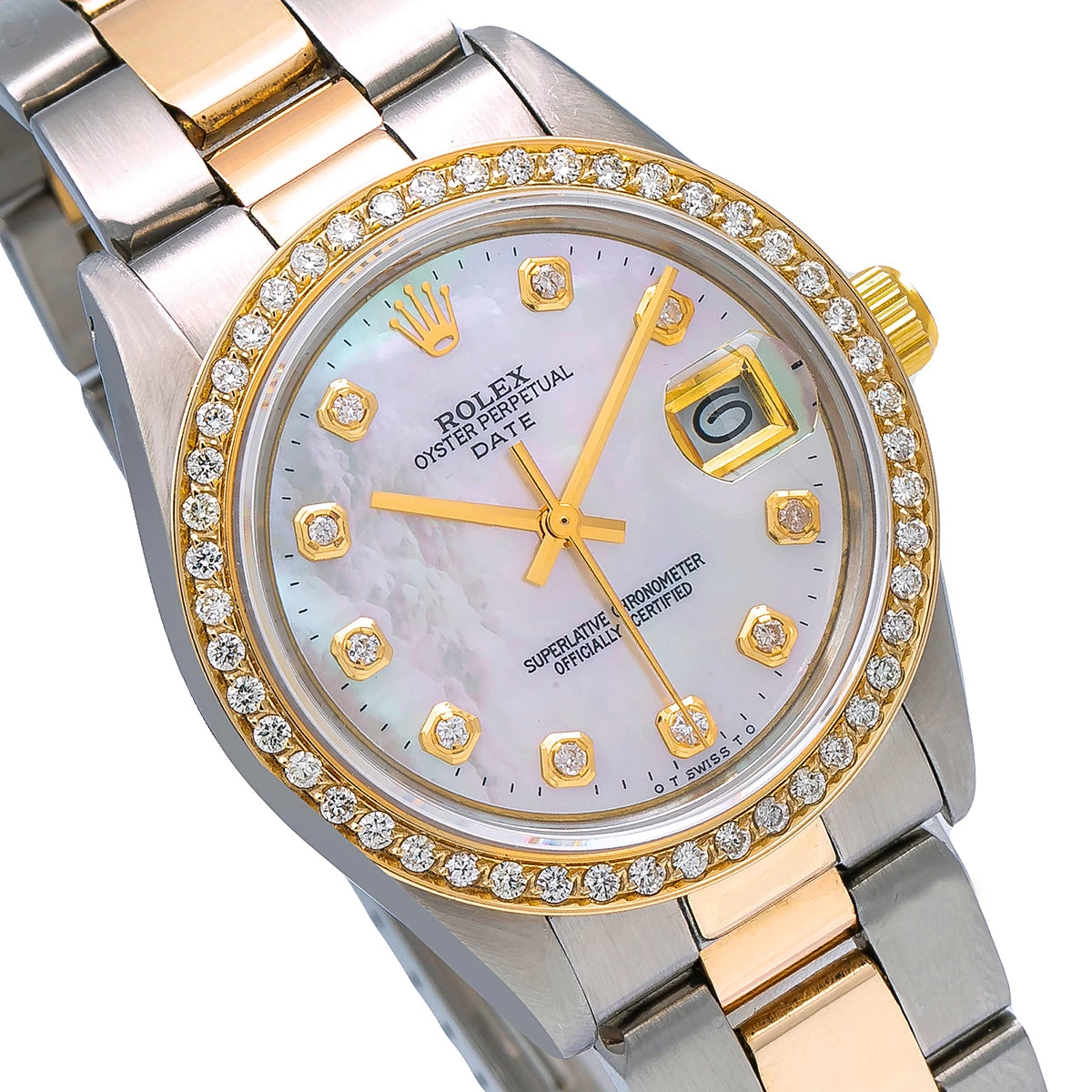 Women’s Diamond Yellow Gold Oyster Perpetual Datejust 34mm Rolex Watch With Mother-of-Pearl Dial
